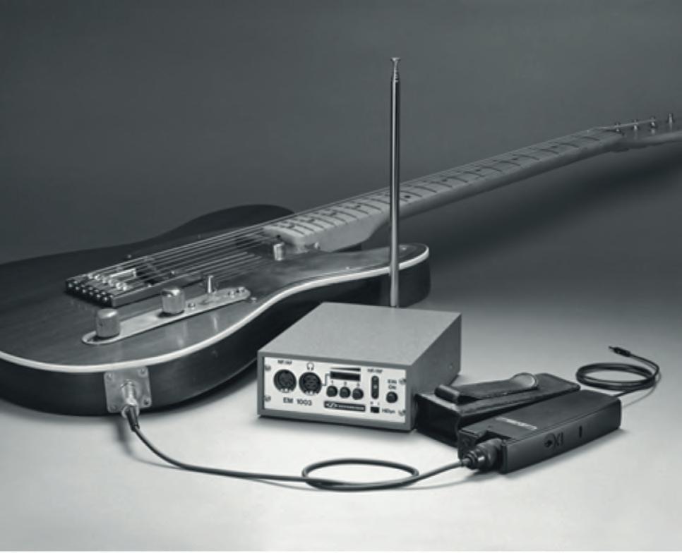 In 1972 presenteerde Sennheiser op de beurs van Frankfurt een ‘radiogitaar’ die draadloos verbonden kon worden met een SK 1008 zender, waarbij de snaren als antenne werkten. Bovendien kon ook een microfoon op een flexibele houder op het instrument worden aangesloten - de muzikant was dan niet langer gebonden aan een specifieke plaats op het podium en kreeg volledige bewegingsvrijheid. En om de bestaande instrumenten op de markt te ontkoppelen, hadden de ingenieurs van Sennheiser draagbare RF-zenders ontwikkeld die aan de gitaarband werden bevestigd.