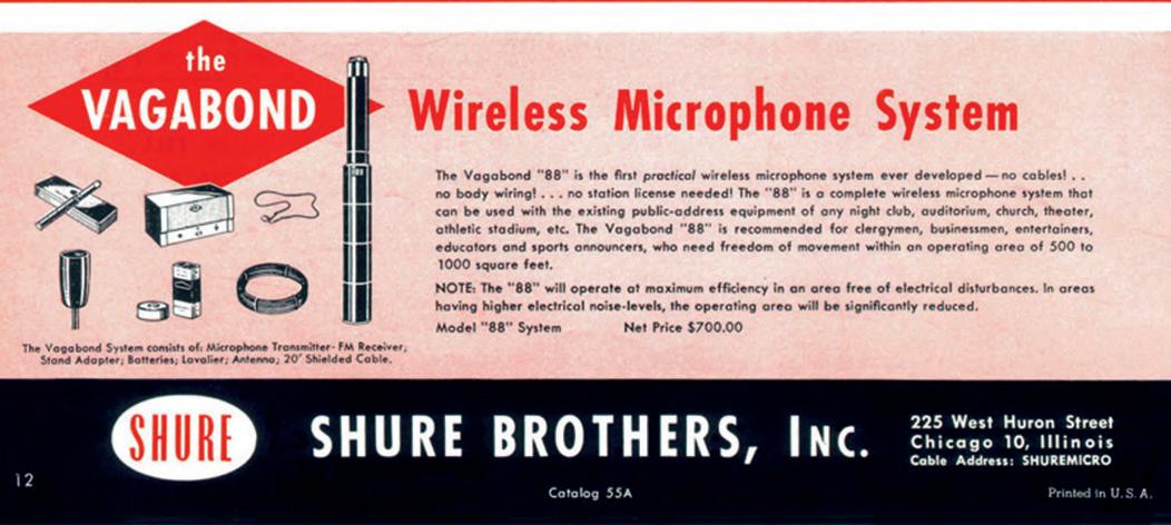 De eerste aanspraak op een draadloos microfoonsysteem voor gebruik op een podium kwam in 1953 met het Vagabond 88 systeem van audiobedrijf Shure Brothers. De microfoon werkt op twee batterijen en heeft een bereik van circa 65 vierkante meter. Om het toestel te gebruiken, werd een draadantenne rond het podium geplaatst.