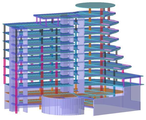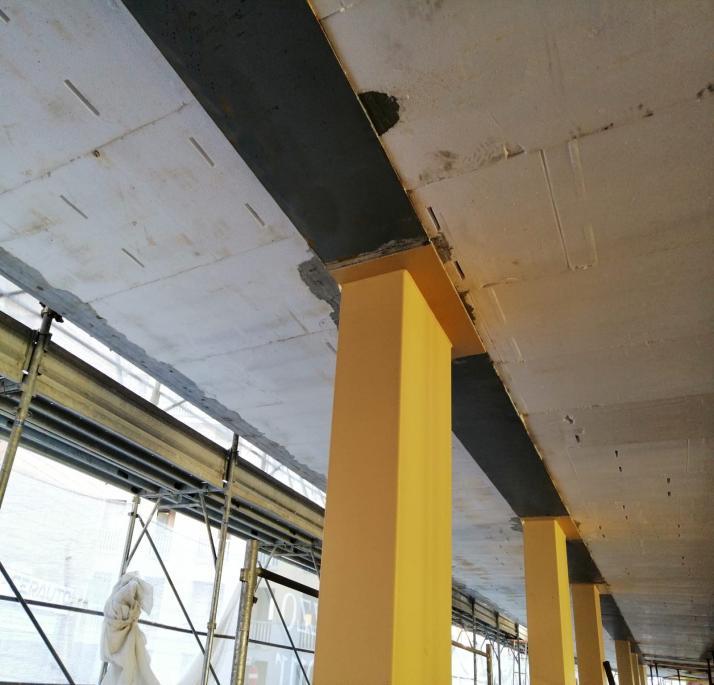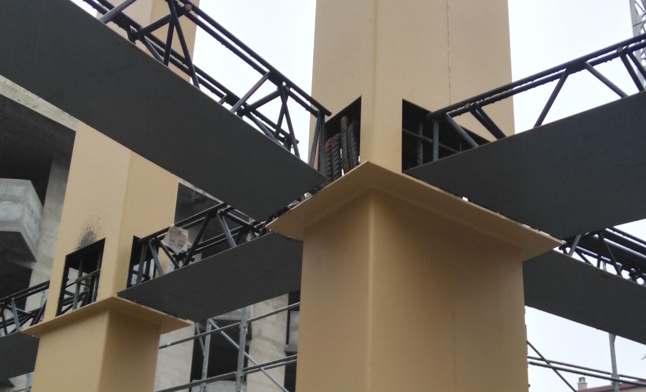 3 conci pluripiano di Pilastri concamicia in acciaio e fustoin cls armatogettatoin opera, Travi Tralicciate con fondello in acciaio, in spessoresolaio,abbinate al solaio IsothermTermosolaio,che haconsentitodi alleggerireinmanieraimpressionanteilpeso dell’impalcato,fattore essenziale nei fabbricati alti.