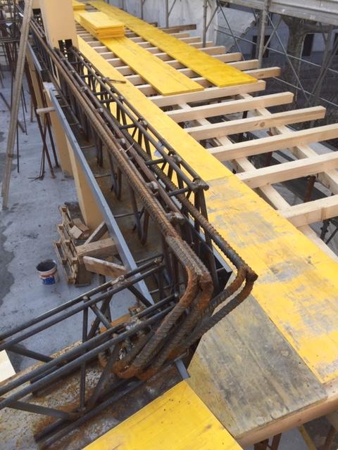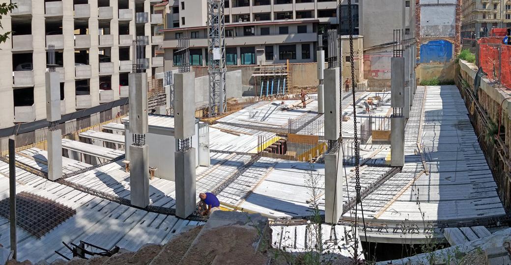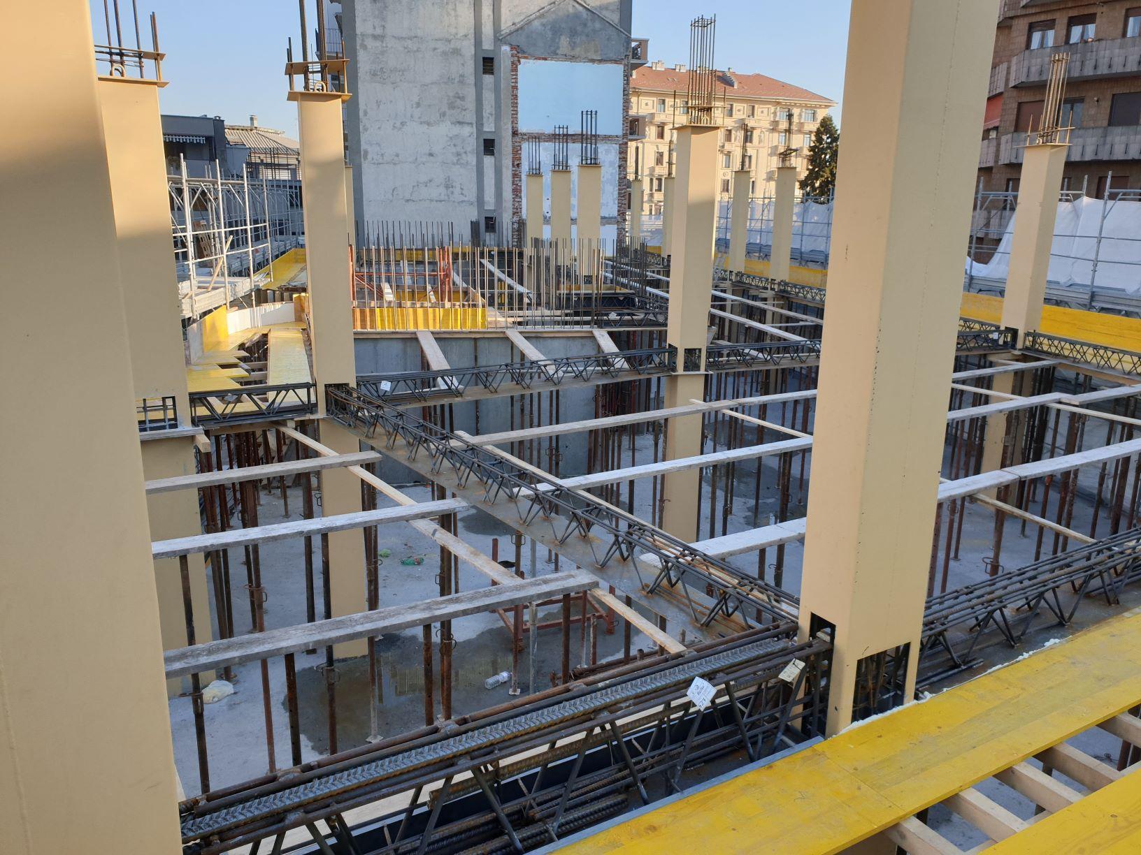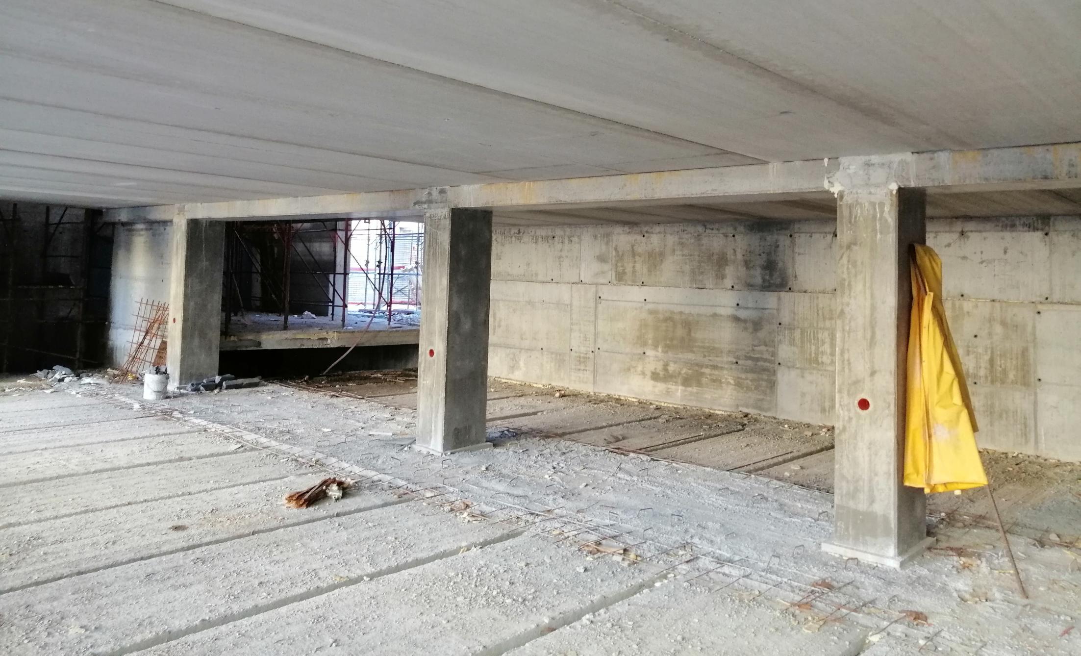 Piano interrato. Pilastri tripiano a nodo umido e Travi PREM con fondello in cls. Si vedono in maggioranza nodi tipici del sistemacon travi autoportanti, senza bisogno di alcun puntello né di antiestetichemensole.