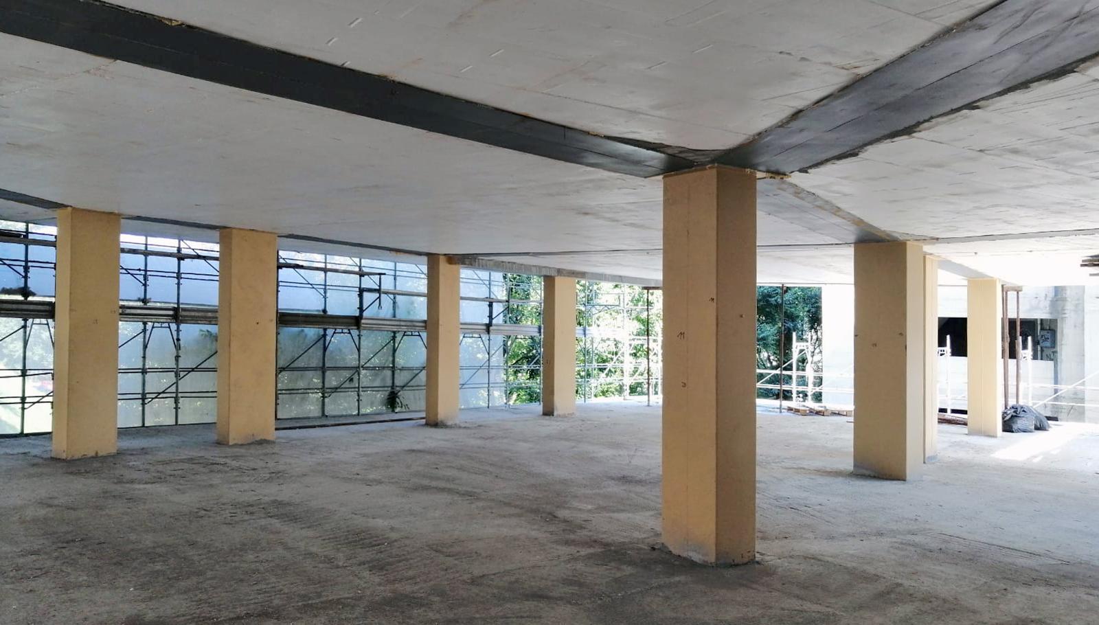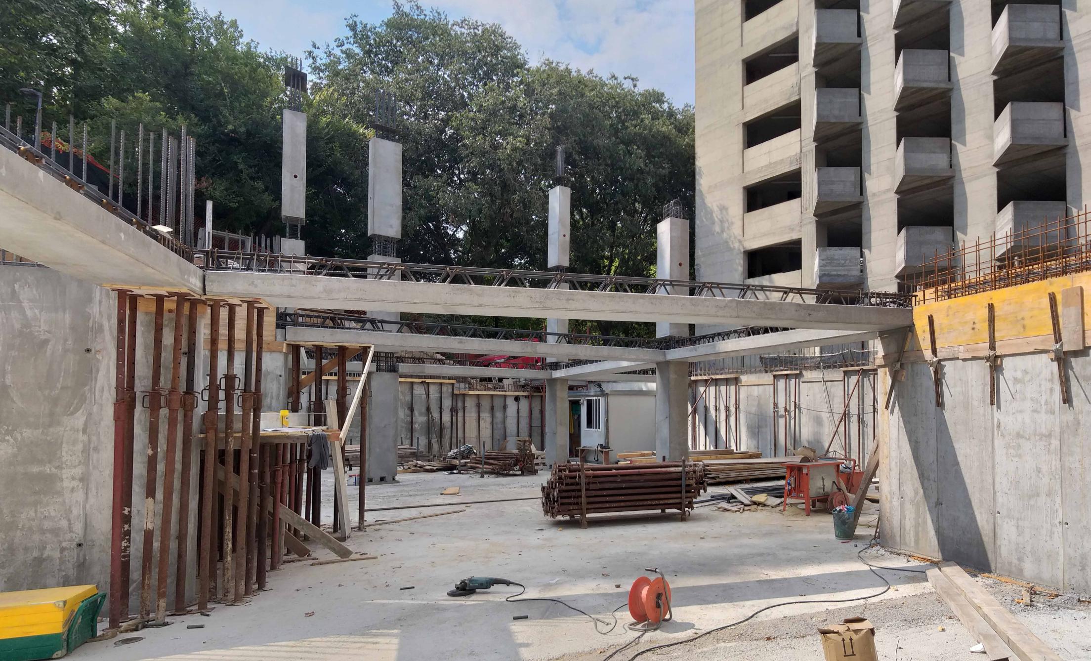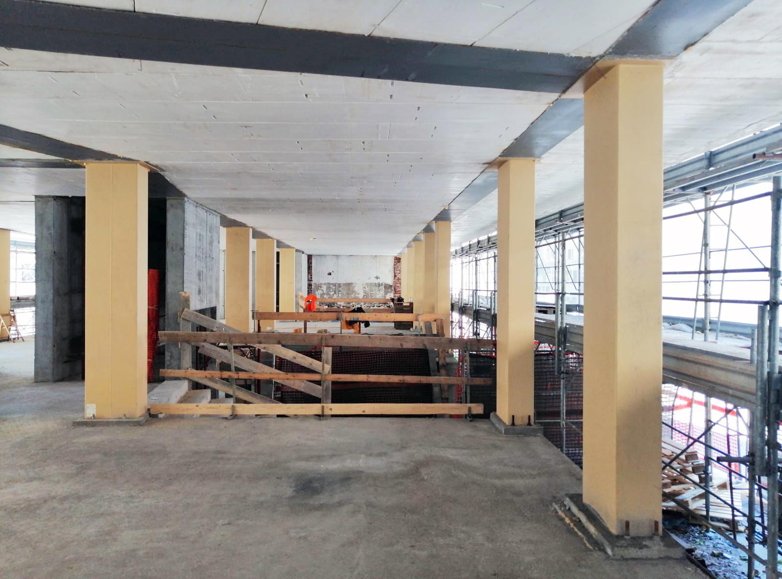 Piano interrato. Pilastri tripiano a nodo umido e Travi PREM con fondello in cls. Si vedono in maggioranza nodi tipici del sistemacon travi autoportanti, senza bisogno di alcun puntello né di antiestetichemensole.