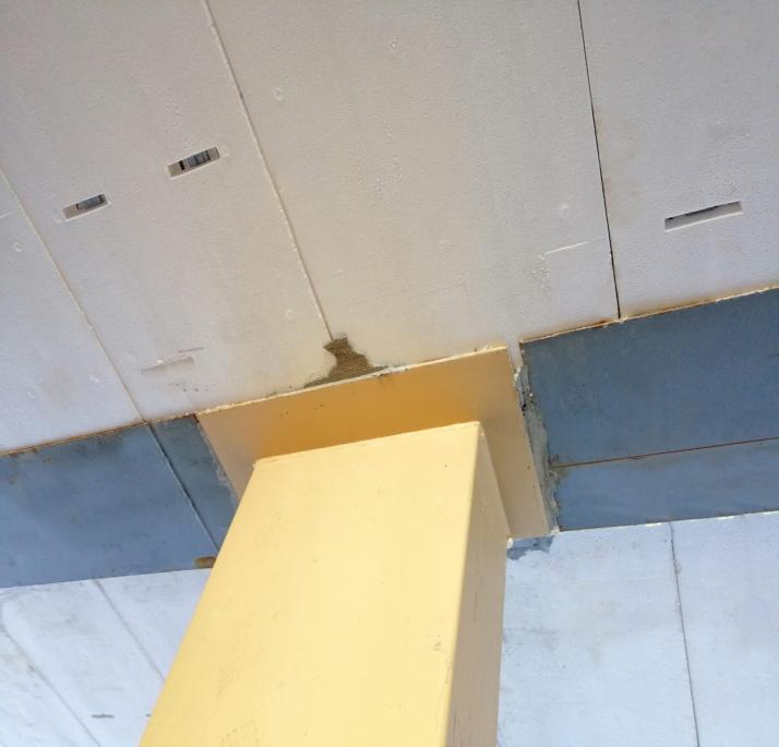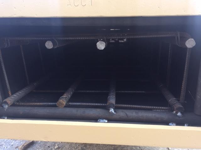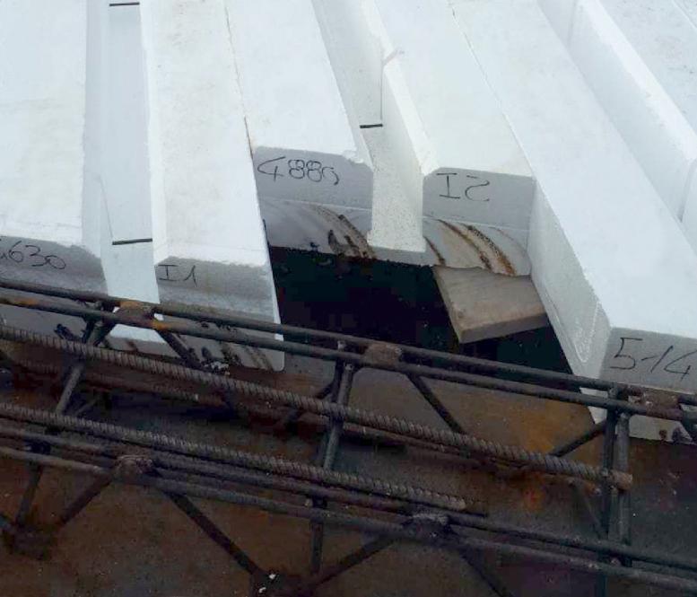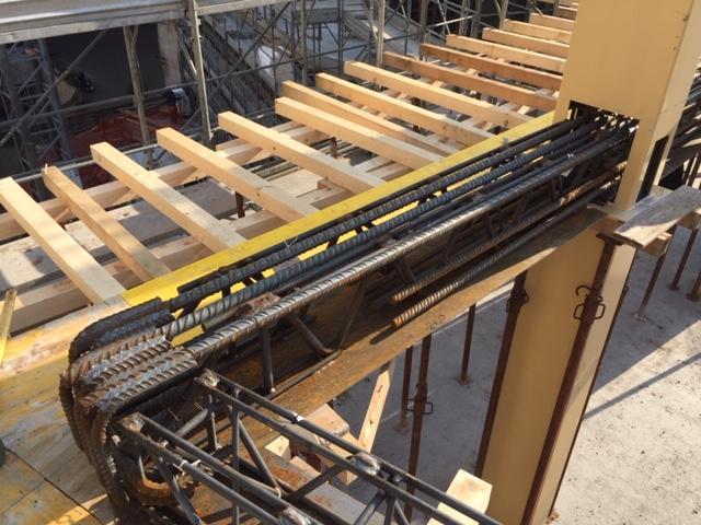 Particolare del nodo. Travi PREMcon fondello in acciaio posate su mensolinein acciaio di pari spessore.Attraversole asole passerannomonconi e cls sì da creareun telaio monolitico.