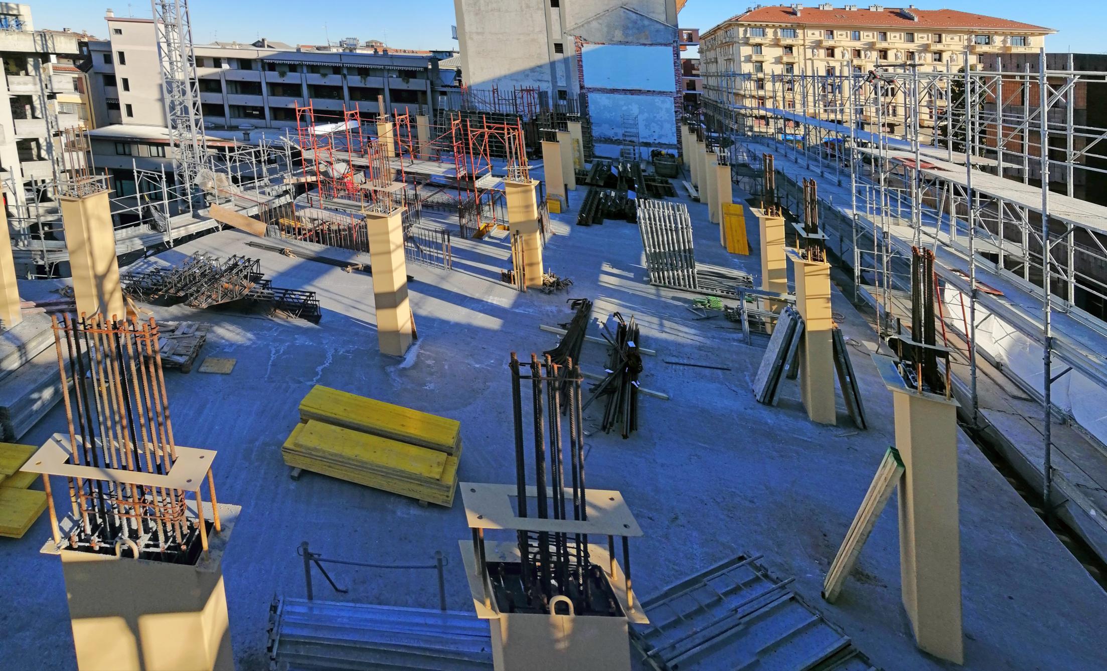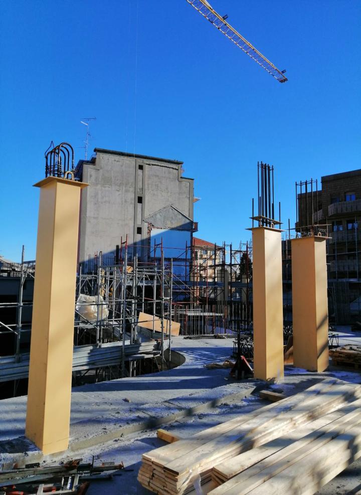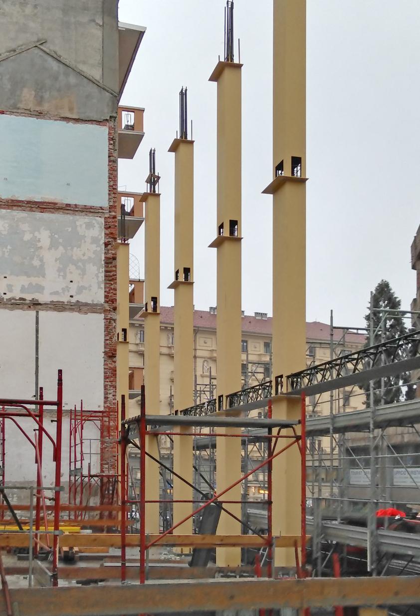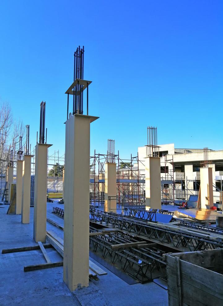 Prosegueil montaggio dei pilastri tubolari tripiano intestatisui pilastri prefabbricati in cls dei primi trepiani interrati.