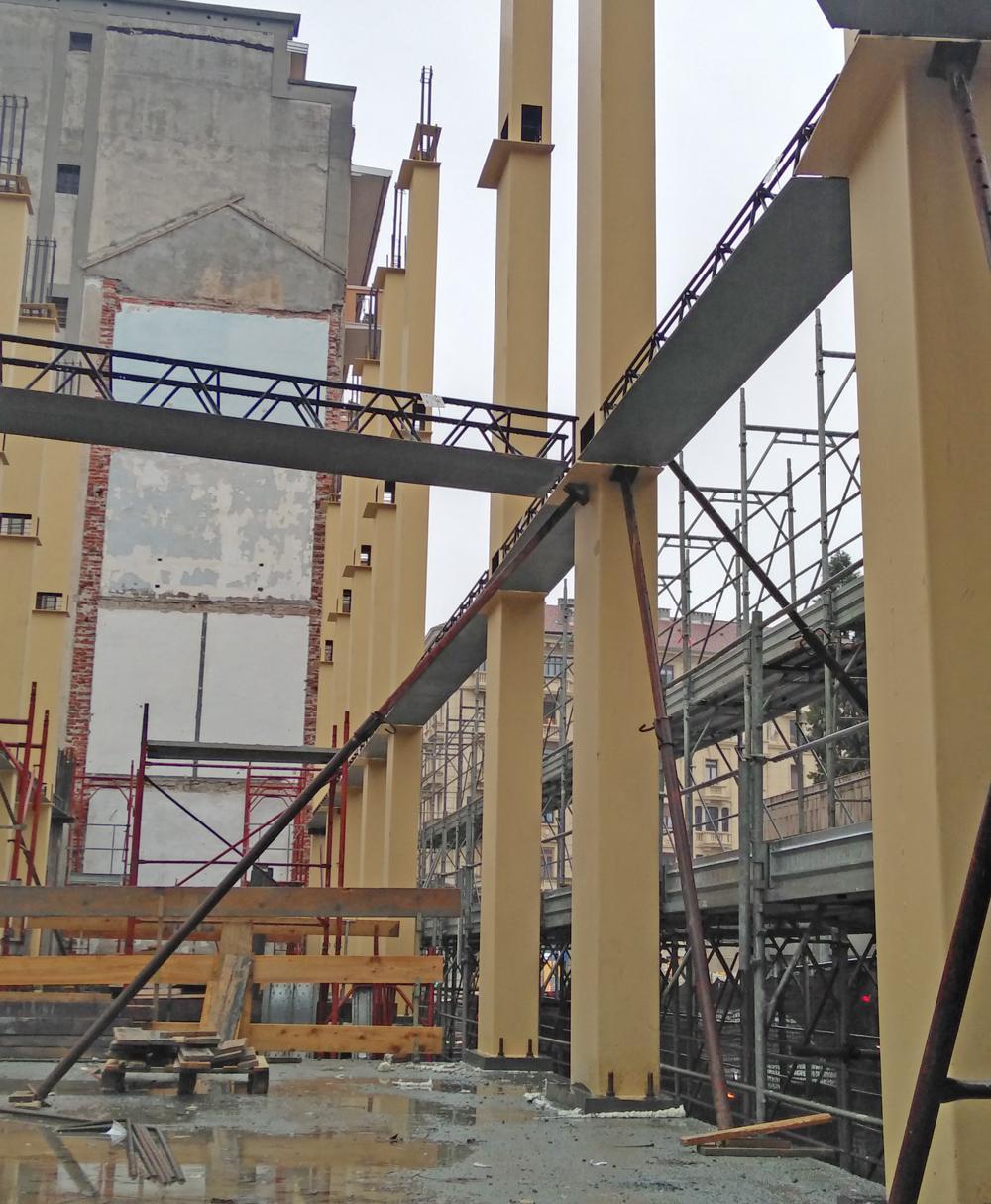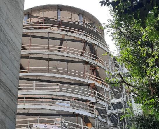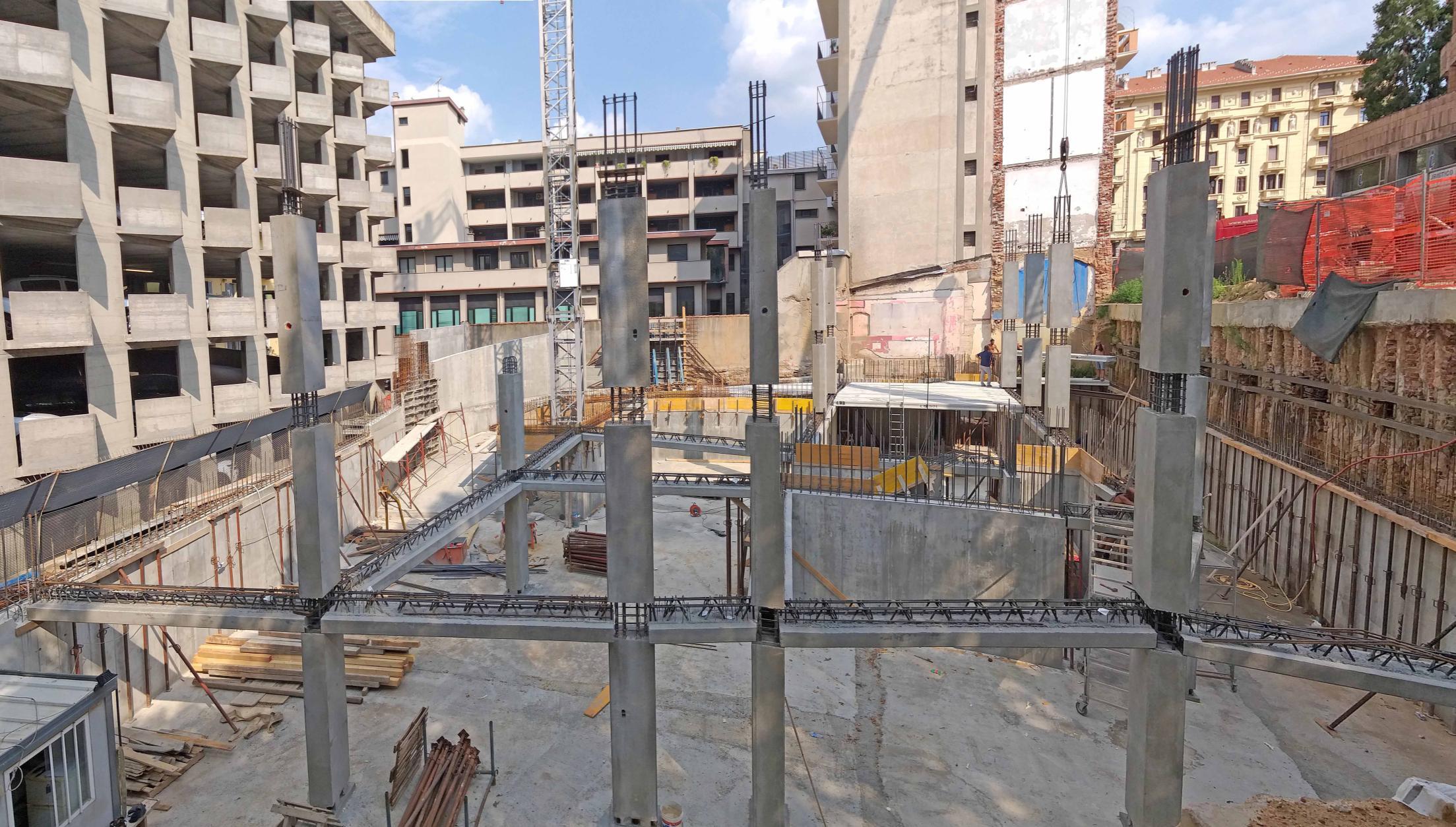 Prosegueil montaggio dei pilastri tubolari tripiano intestatisui pilastri prefabbricati in cls dei primi trepiani interrati.