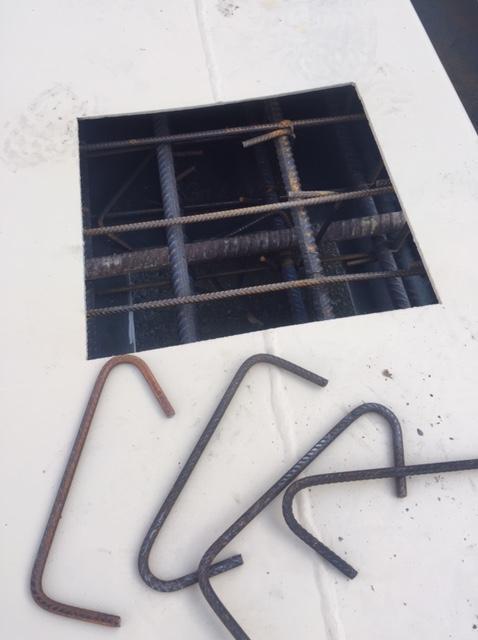 Si evidenziano i ferri di ripresae i tirafondi utilizzati per il montaggio del concio successivodei pilastri