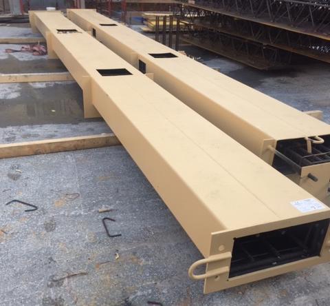 Stoccaggio nell’officina di produzione: pilastri pluripiano con camicia d’acciaio, attrezzata di mensole ascomparsa,e gabbia interna da c.a.. Dopo il getto, la struttura assumele caratteristiche diun telaio monolitico in c.a. tradizionale.