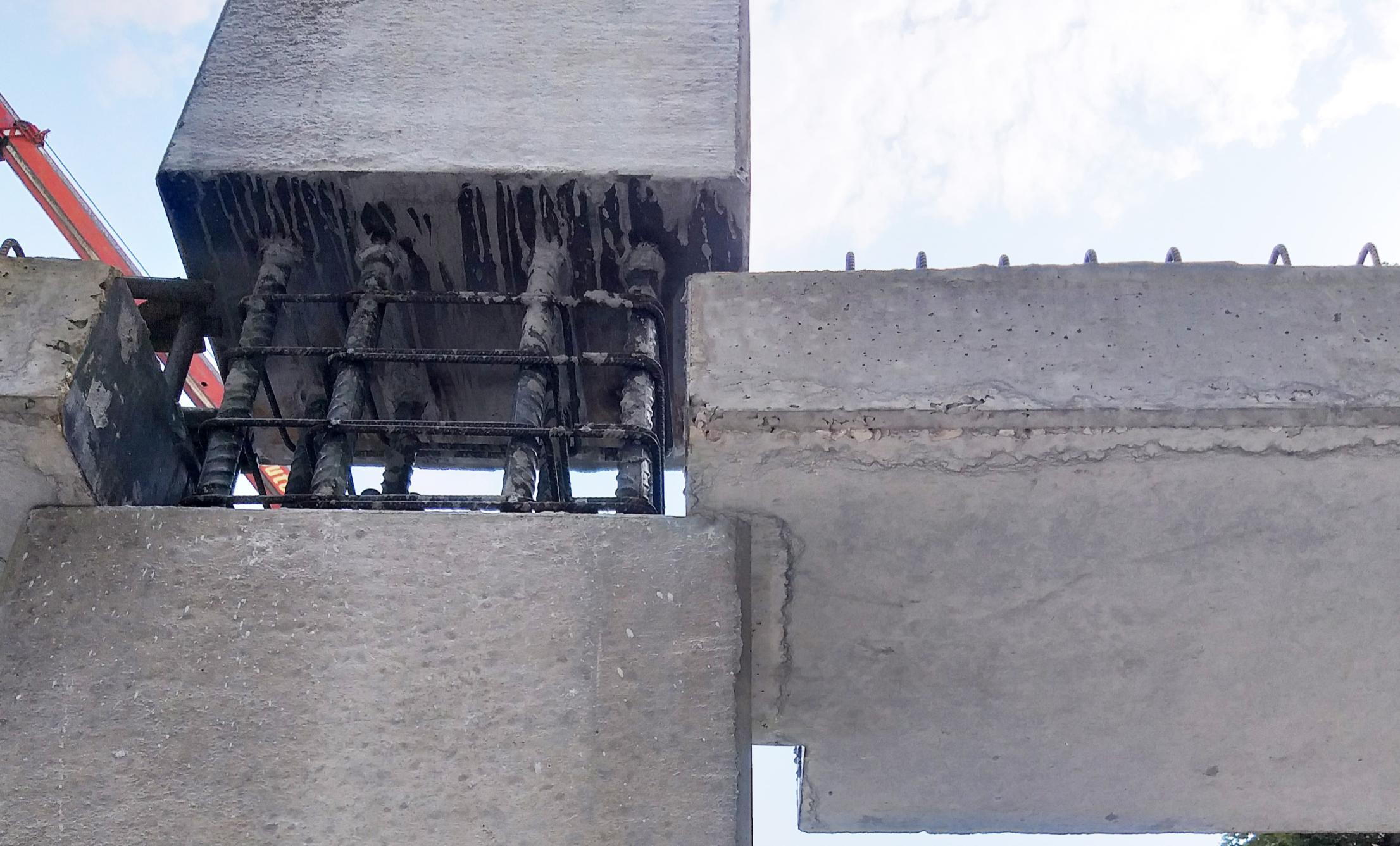Nodo pilastro-travea nodo umido strutturalee senza mensole. Dopo il getto si ottieneun nodo monolitico in c.a..