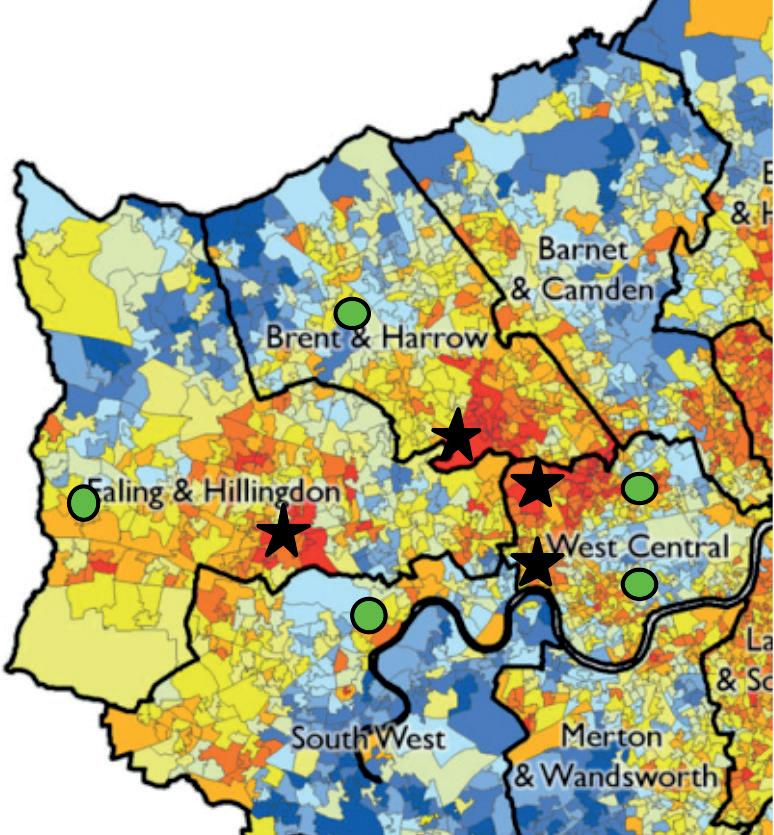 2.22 Dr Gurjinder Singh Sandhu, a consultant in infectious diseases and acute medicine at Ealing Hospital, provided the Commission with a map, previously submitted to the Independent Reconfiguration Panel, that superimposed SaHF emergency department closure plans over areas of deprivation (see over page). This clearly shows that the hospitals where service closures have occurred or are planned are located in areas of high deprivation.