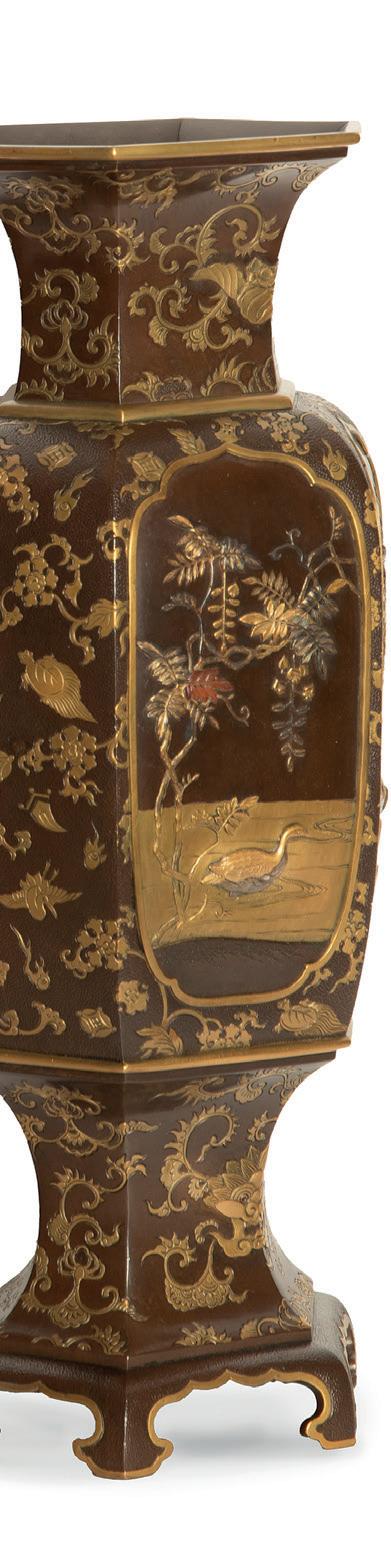 A most unusual shaped pair of carved and gilded bronze vases from the highly regarded studios of Miyao Eisuke of Yokohama. The large and complex six sided vases stand upon a shaped bracket foot that gives rise to a lower section decorated with mythical beast amidst carved and gilt flora. Above this the carved and gilt decoration continues around the six sides as stylised flora interspersed with flaming pearls, minogame and birds in flight, this decoration further continues up to the flared neck rim. The main bodies of each vase house pairs of panels to each elevation thus allowing four panels of your choice to always be on display. One side of the vases displays tranquil scenes of ducks in a lakeside setting beneath trailing wisteria, by contrast the reverse displays scenes of Samurai in various pursuits as well as a seated female attendant alongside a weary traveller. This panel is fully signed and sealed for Miyao Eisuke.