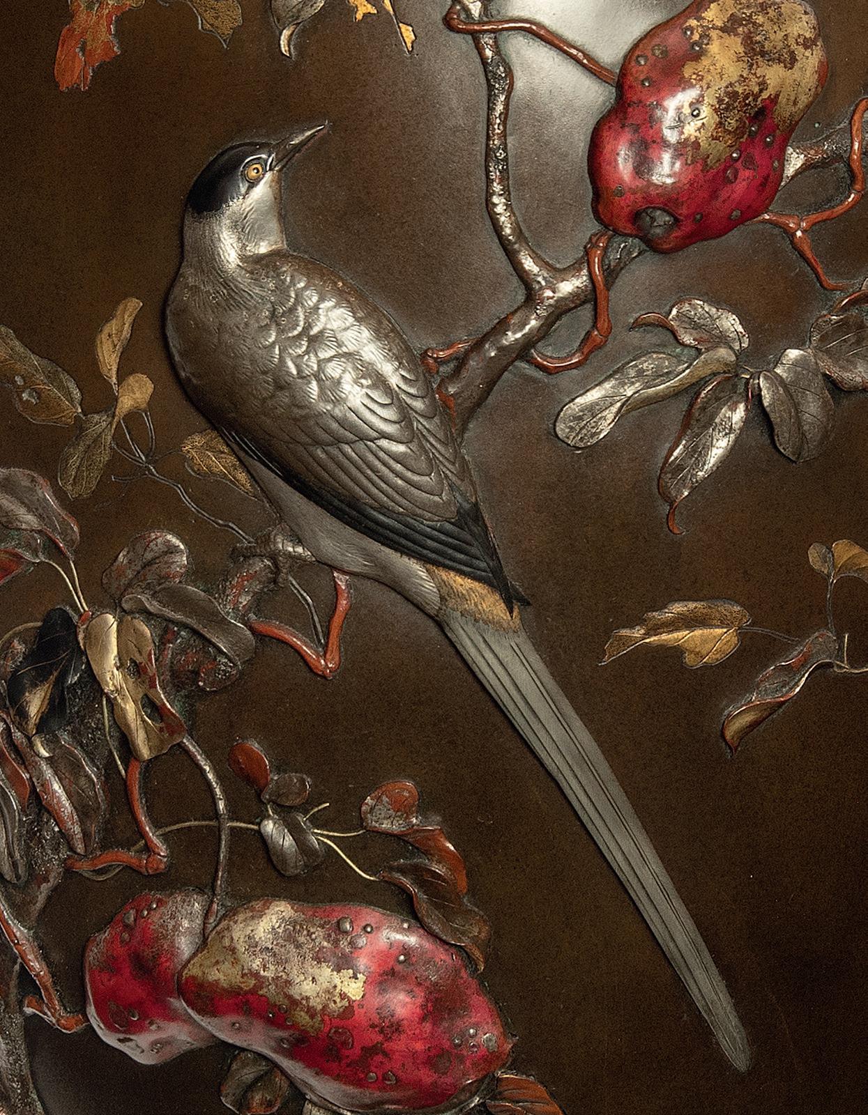 This handsome pair of vases are based on a design by the Rimpa school painter Sakai Doitsu (1846-1913), a retained artist working for the company, indeed the signature “Doitsu zu, Yukimune sen kore”, with the gold seal “Sugiura” bears testament to Doitsu’s involvement in this fine collaboration. The large heavy quality baluster shaped vases stand upon a spreading bracket foot decorated with mixed metal moths beneath a band of stylized flora, the bronze bodies provide a super contrast to the opulent mixed metal decoration depicting birds at rest upon the branches of fruit trees. The incredibly worked feather detail and foliage in relief is formed from soft alloys including gold, silver, copper and shibuichi to an extremely high level of workmanship. To the reverse we witness exquisite sprays of gold narcissus to one vase with sprigs of native flora to the other, the shoulders and neck rims decorated in mixed alloys with stylized moths amidst trailing flora. Each vase bears the artists signatures and gold seal to one side.