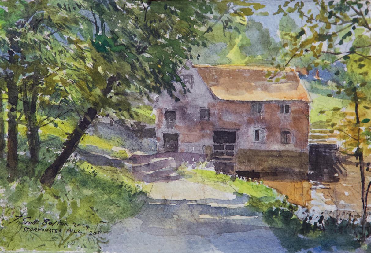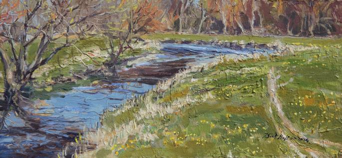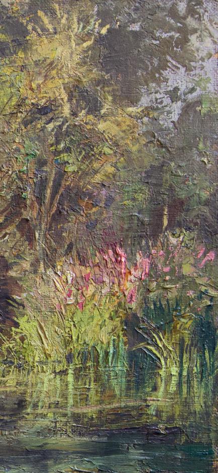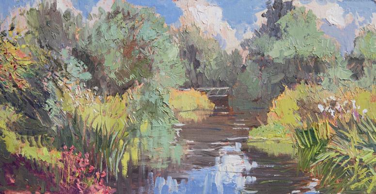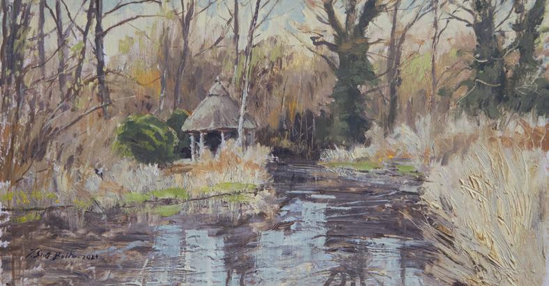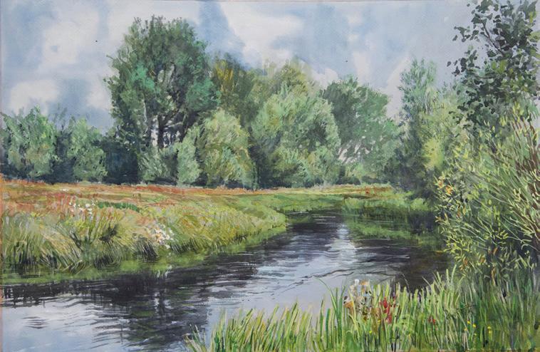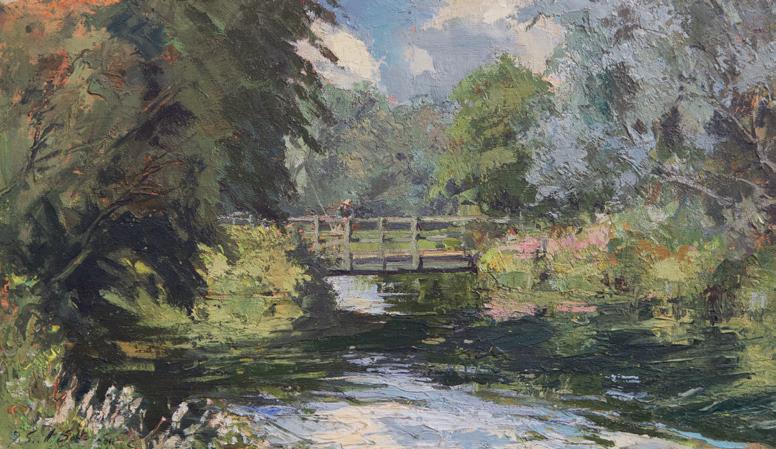 A tranquil scene near Durnford where, on a June afternoon I did this oil. A wren, whose nest was in a willow tree next to where I was painting, forsook all fear and continued to feed her young a foot from my head.