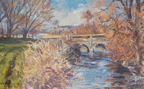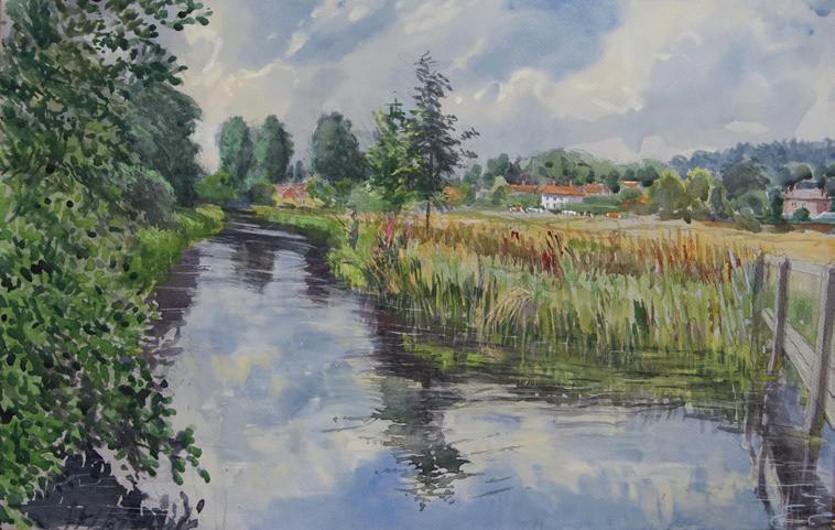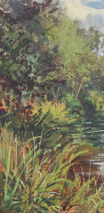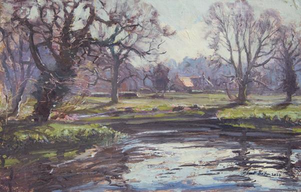 This little oil was painted in July, when the swallows skim the water to feed their hungry broods. The unity of the picture is given by painting on a mid-tone, warmcoloured board. The river is a reflection of the sky and this creates a bright and airy feel.