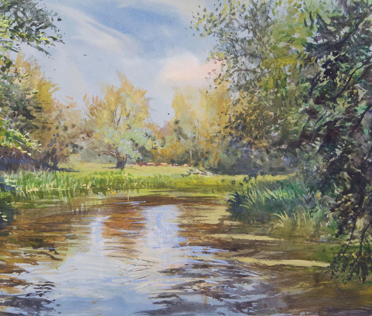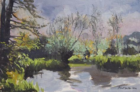 River Avon below Amesbury painted in oil. Note how, where the water meets the bank, the reflections merge between the two. I painted this as if the water’s edge did not exist because that is how I saw it.