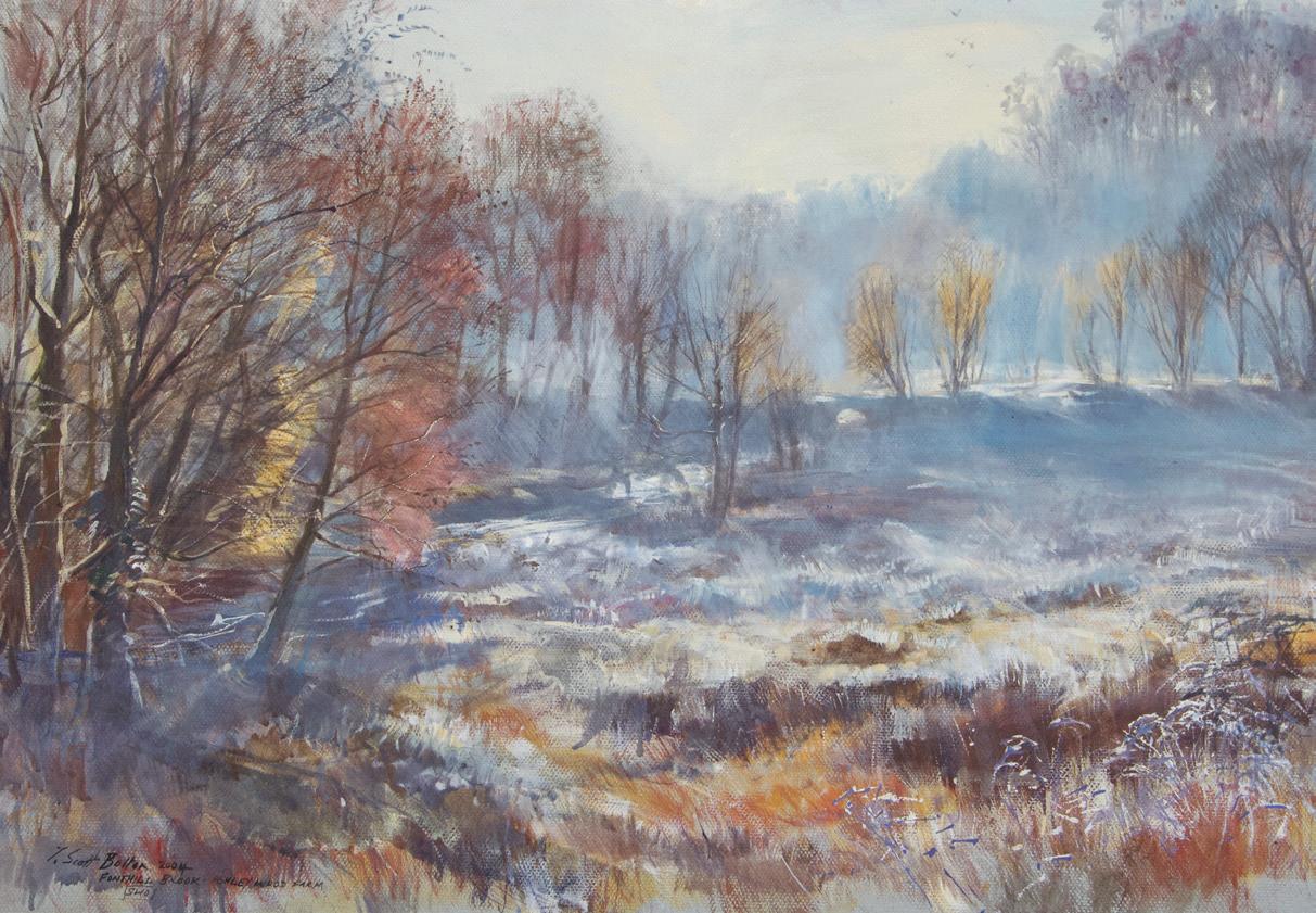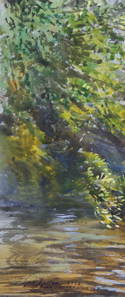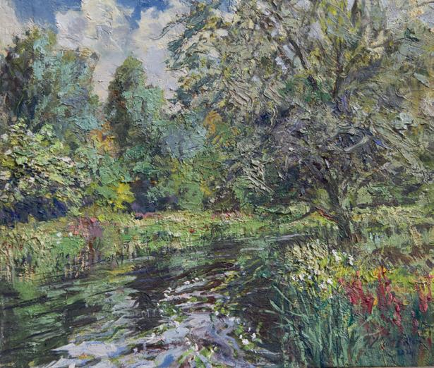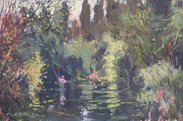 Tim Scott Bolton has fished since he was a boy and the painting of rivers has played a significant role in his work as an artist. A river could be considered a thread that connects the different phases of his life. His pictures both stand alone in their own right and simultaneously convey a knowledge and understanding of the ways of a river, executed with an angler’s eye.