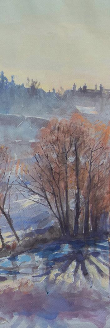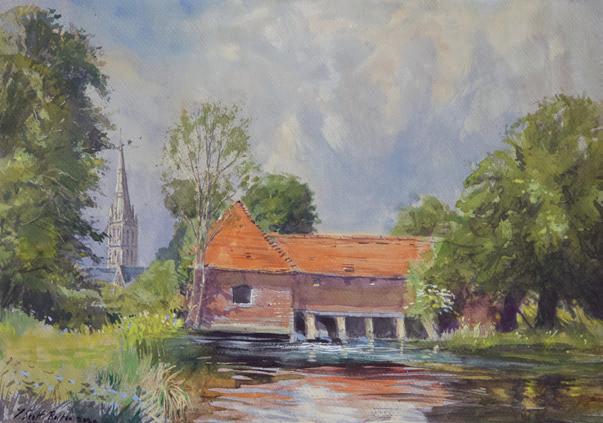 This is the northern end of the Salisbury Plain, painted with gouache on grey paper. The water meadows are extensively grazed by sheep and, to create a sense of space, I have contrasted the shaded foreground with the sun-drenched church beyond.