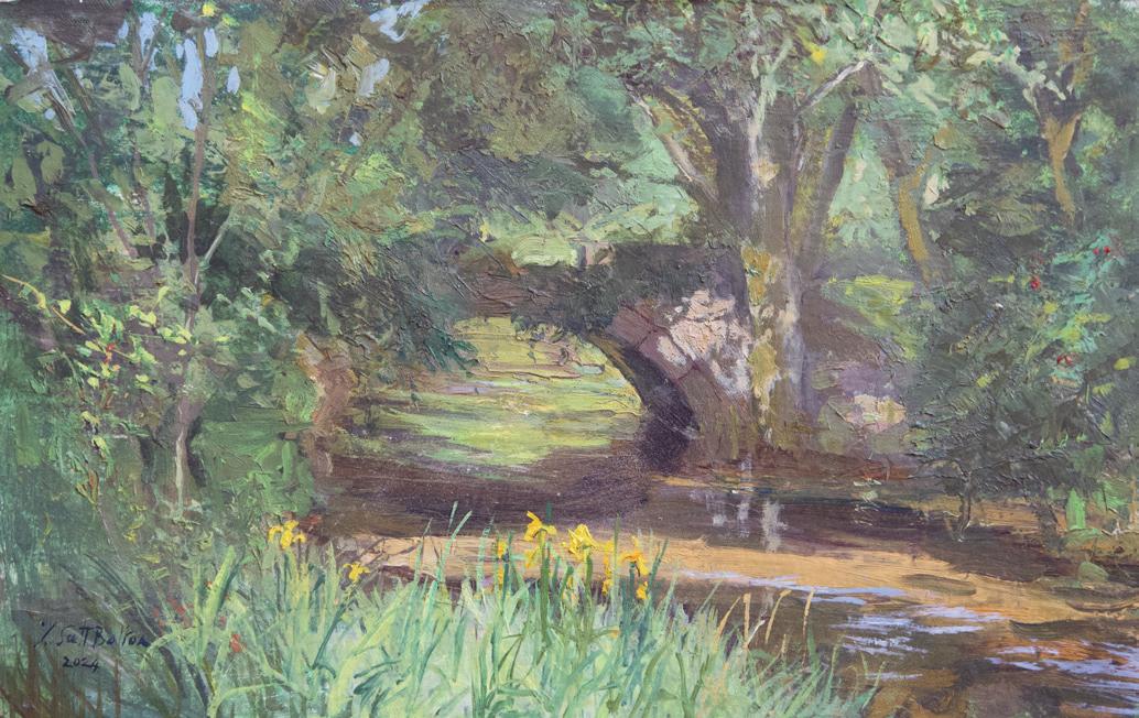 Gunville Cottages, now only a bridge over the river where there used to be a weir. This is a small oil painted on a hot summer’s afternoon.