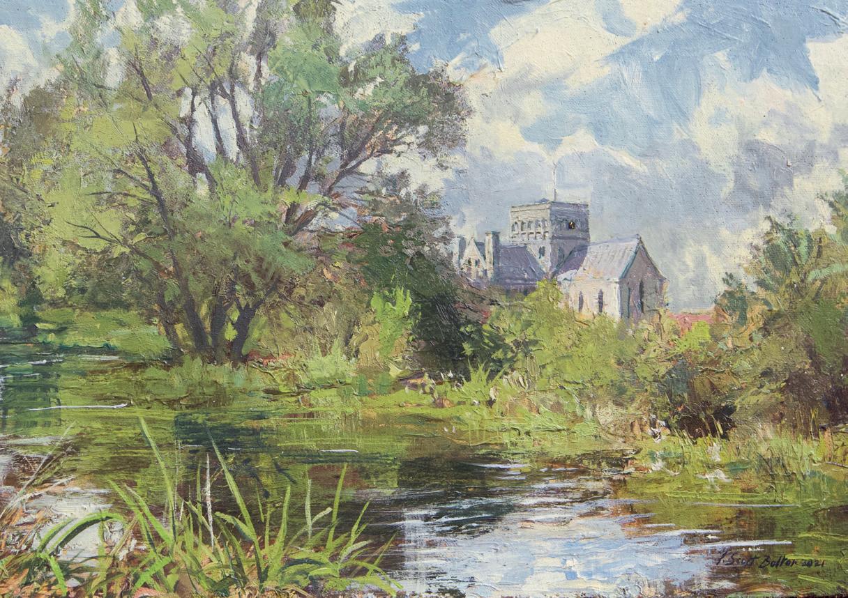 St Cross peeps at the Itchen like a wary angler. An oil painted on a moody day. I was thankful for my circle of shelter under a large umbrella when thunderous rain erupted from a heavy summer sky and I munched my picnic.
