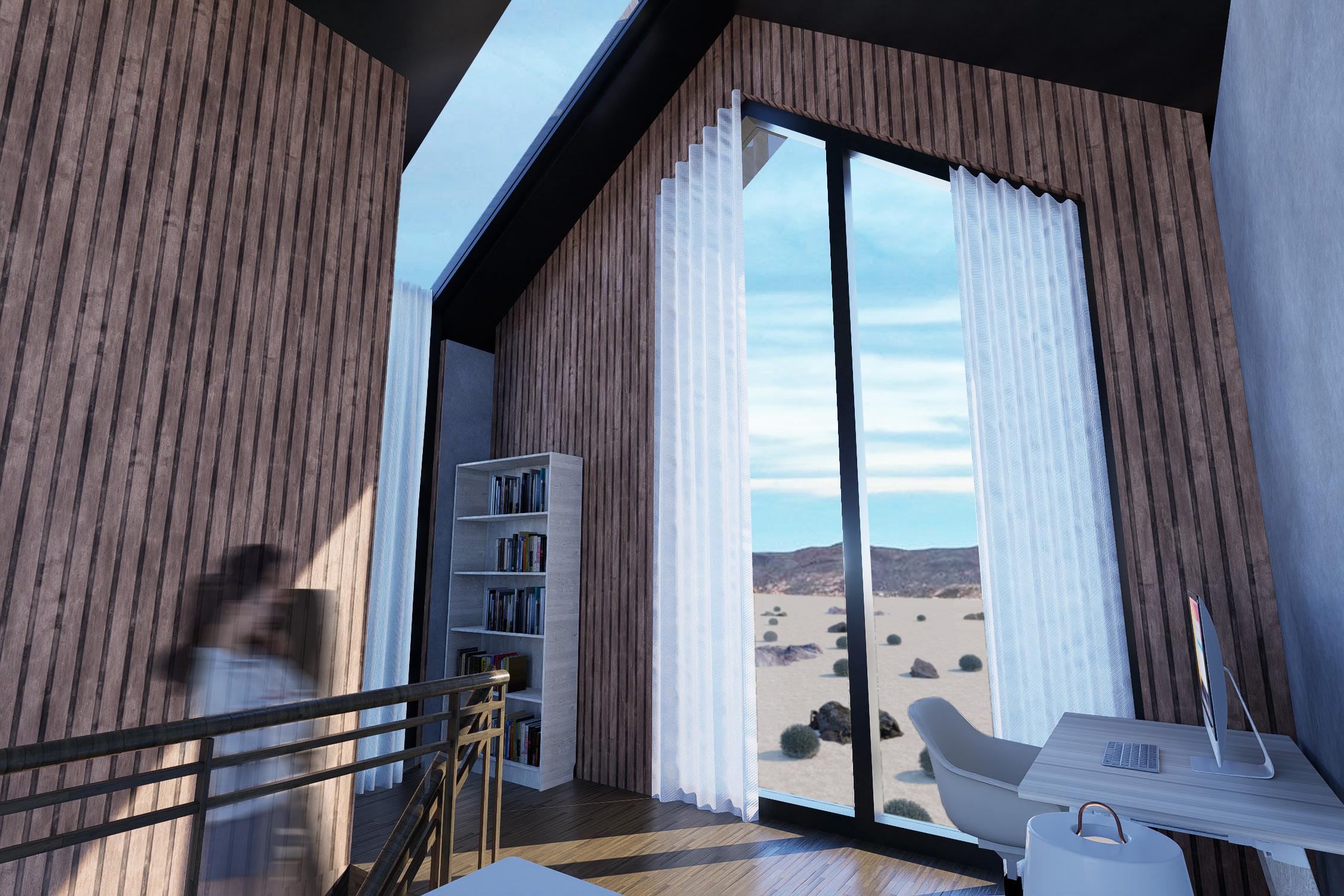 The site is located in Joshua Tree, California on a fairly flat desert area with rocks, creosotes, and wide open views. The overall design of the micro home focuses on passive systems. The tall glass facades facing northeast and southwest are not only aesthetic features that distribute light, but are also designed to minimize heat gain. Skylights evenly bring in daylight across both floors, resulting in the creation of natural ventilation and air flow from all directions.