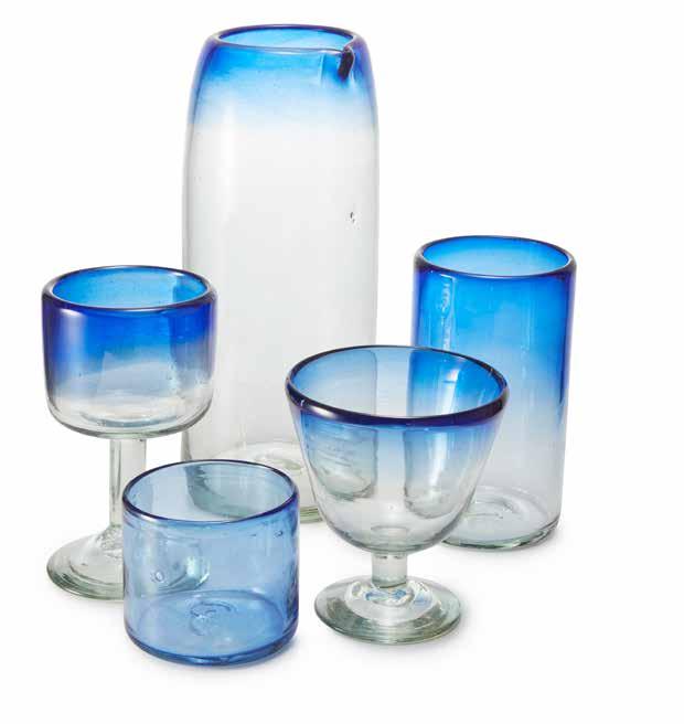 D . Iridescent Turquoise Glassware, $16-$98 E . Ombré Indigo Napkin, $26 F. Ombré Teal Napkin, $26