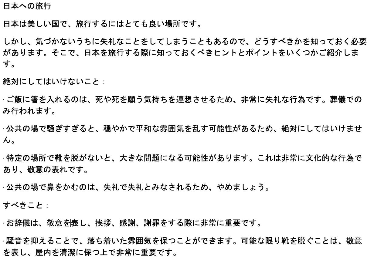 keii o arawashi, aisatsu, kansha, shazai o suru sai ni hijō ni jūyōdesu. • Sōon o osaeru koto de, ochitsuita fun’iki o tamotsu koto ga dekimasu. Kanōnakagiri kutsu o nugu koto wa, keii o arawashi, okunai o seiketsu ni Nihon e no ryokō Nihon wa utsukushī kuni de, ryokō suru ni wa totemo yoi bashodesu. Shikashi, kidzukanai uchi ni shitsureina koto o shite shimau koto mo aru node,do u subeki ka o shitte oku hitsuyō ga arimasu. Sokode, Nihon o ryokō suru sai ni shitte okubeki hinto to pointo o ikutsu ka go shōkai shimasu. Zettai ni shite wa ikenai koto: • Gohan ni hashi o ireru no wa, shi ya shi o negau kimochi o rensō sa seru tame, hijō ni shitsureina kōidesu. Sōgi de nomi okonawa remasu. • Kōkyō no ba de sawagi sugiru to, odayakade heiwana fun’iki o midasu kanōsei ga aru tame, zettai ni shite wa ikemasen. • Tokutei no basho de kutsu o nuganai to, ōkina mondai ni naru kanōsei ga arimasu. Kore wa hijō ni bunka-tekina kōideari, keii no arawaredesu. • Kōkyō no ba de hanawokamu no wa, shitsurei de shitsurei to minasa reru tame, yamemashou. Subeki koto: • Ojigi wa, tamotsu ue de hijō ni jūyōdesu.