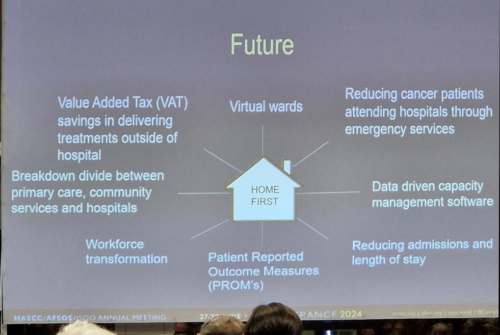 Først hørte vi om den franske model ved Ghlslaln Promonet CEO, som talte om en bedre kvalitet for patienterne og bedre overlevelse efter at man er begyndt at monitorere patienterne via en sygeplejestyret telemonitorering, hvor patienterne via PRO (Patient Rapporteret Outcome) data kunne skrive til