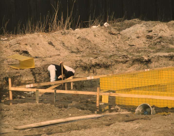warme gloed. De liefde voor geschiedenis en Urk is even tastbaar. Het zand scheppen ze op een stuk zeildoek, om de sporen daarna zoveel mogelijk te wissen. De steen wordt losgemaakt en in de kuil gegooid, maar dat gaat helemaal verkeerd. Om hem gedeeltelijk uit te laten steken en zo zichtbaar te laten worden bij de nieuwe fundering, moes de steen worden verschoven. Plank eronder, touwen eromheen, optillen, trekken. De adrenaline krijgt vrij spel. Af en toe stoppen ze met graven, luisteren en kijken ze rond of ze iets horen of zien. Het blijft gelukkig stil. Na hard werken ligt het gevaarte van 360 kg Portlandcement vermengd met zand uiteindelijk op zân plek. Als het afgedekt is met zand herinnert niets meer op de donkere bouwplaats aan het schouwspel van even daarvoor.