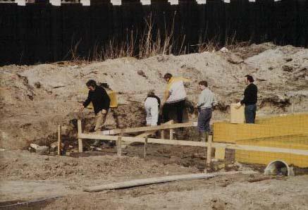 Bij het terrein van de bouwplaats aangekomen wordt de aanhanger met de steen naar de vindplaats gereden. Daar wordt eerst, vlak bij de rand van de nieuwe fundering, een gat gegraven. Op de bodem van het gat treft men schelpenzand aan, resten van de zandstrook rond de voormalige zeewering. Alsof ze weer even aan de rand van het oude eiland aan het graven zijn. De twee mannen ervaren even een