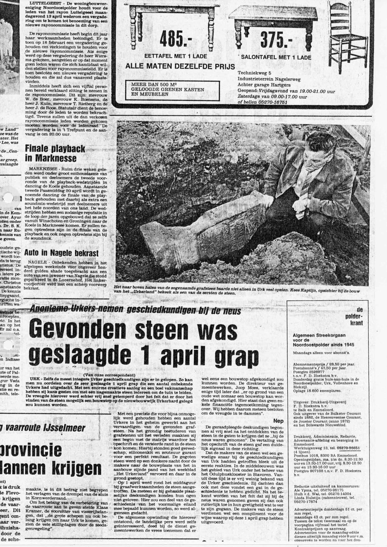 selijke museumâ. In de loop van de vrijdag wordt de steen opgehaald door medewerkers van Gemeentewerken. Daar wordt hij opgeslagen in een afgesloten ruimte. Later blijkt dat men bang was dat de vondst afgestaan zou moeten worden aan âLeidenâ. Een vondst van deze omvang moet nl. binnen 24 uur worden gemeld. De directeur van âHet Urkerlandâ is bang voor een bouwstop en neemt contact op met B&W van de Gemeente Urk. Ook de media krijgt er lucht van. Zo bellen alle kranten en nieuwsmedia. âZeg maar dat het een 1 Aprilgrap isâ, moeten de receptionisten meedelen.