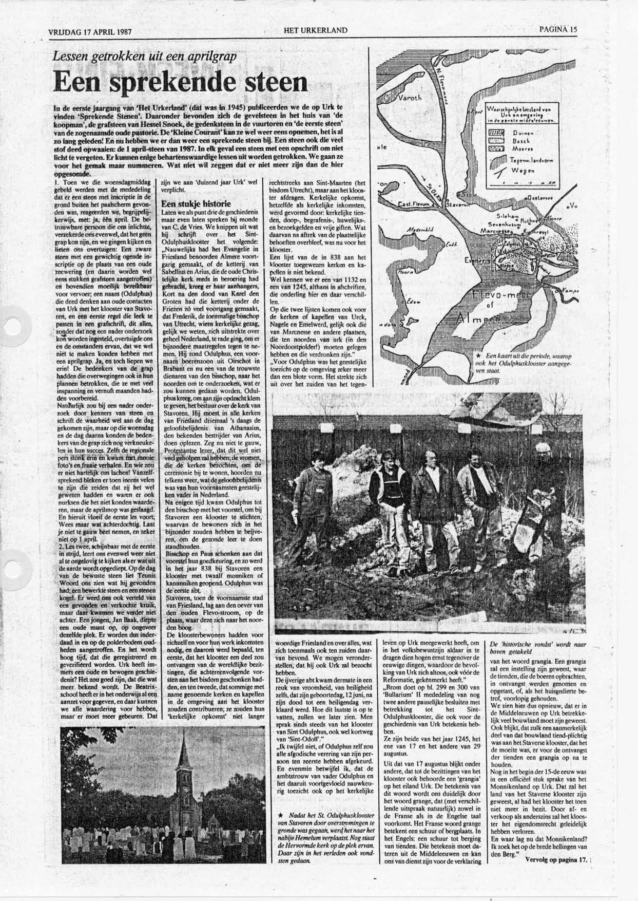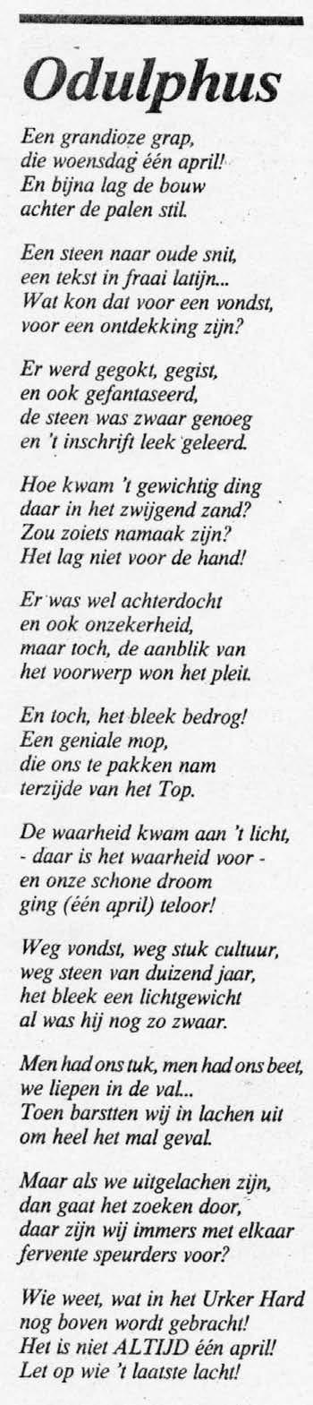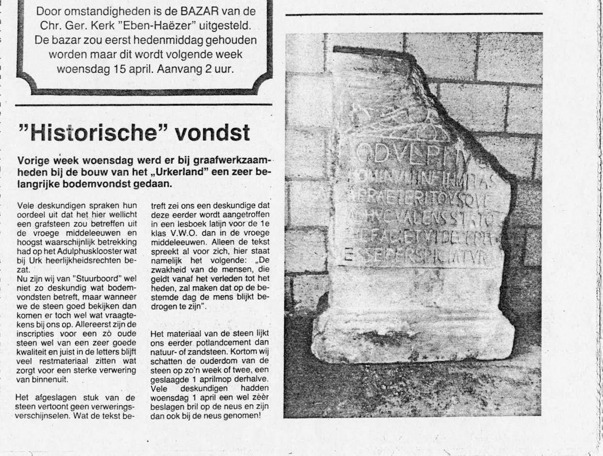 Op 1 april 1987 wordt rond het middaguur, aan de rand van het voormalige eiland Urk, een steen gevonden met een gewicht van 360 kilo. De steen oogt als een soort herdenkingsteen uit het jaar 1000. De tekst is in het Latijn. Het opschrift slaat in als een bom: âOdulphusâ.