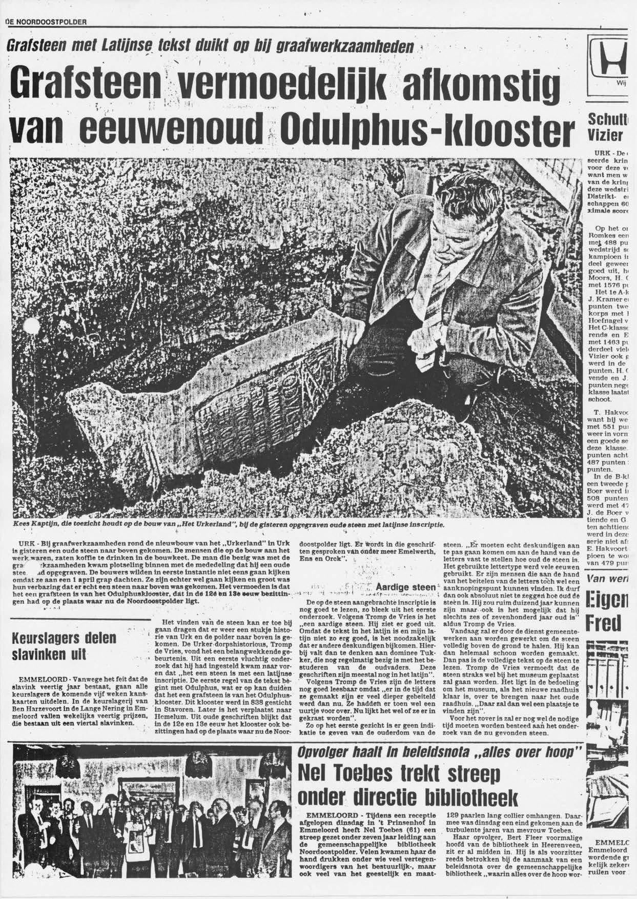 steen zit er niets anders op dan afwachten. Om half zes verschijnt er geen bericht op het journaal over een of andere vondst ergens in het land. Na de feestelijke maaltijd met mosselen en heerlijk wijn, is er nog geen enkel bericht. Zo verloopt ook de donderdag. Alhoewel? In âDe Noordoostpolderâ, krant in de gelijknamige polder, verschijnt een bericht over een bijzondere vondst. Op de foto prijkt de