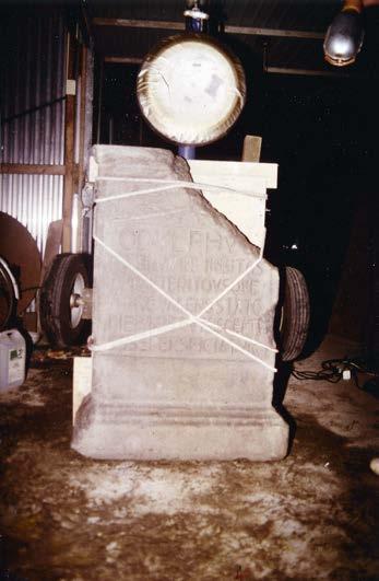 door het weekblad âHet Urkerlandâ ingehuurde opzichter, zittend bij de steen die nog half in de grond begraven ligt. Ook de tweede Urker krant âStuurboordâ komt op donderdag uit met een eerste voorzichtige vermelding en een grote foto van de steen, opgeslagen in het depot van Gemeentewerken.