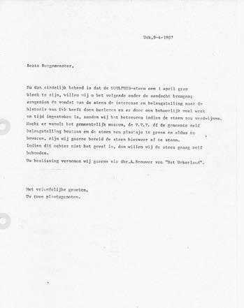 De mannen hebben eigenlijk meer bereikt dan ze hadden voorzien. Er was weliswaar geen berichtgeving op het âhalfzes journaalâ, maar daar staat veel tegenover. Vooral de uitgebreide aandacht in âHet Urkerlandâ maakt veel goed. Enkele maanden later schrijven ze, als twee anonieme Urkers, een brief aan B&W, met de vraag of de steen misschien een plaatsje kan krijgen bij het VVV of Museum Het Oude Raadhuis. Dat laatste wordt het uiteindelijk. De mannen stellen een map samen met alle informatie en bezorgen die ook weer anoniem bij het Museum.
