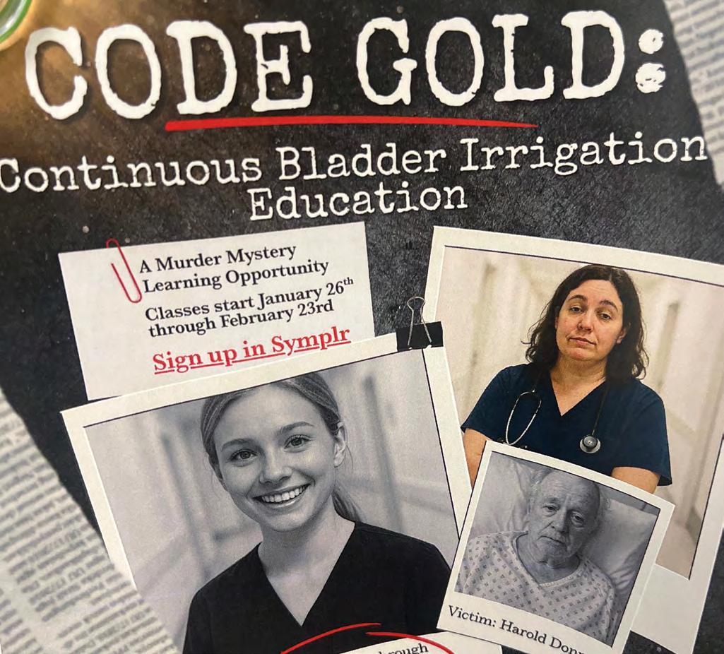 Over the past few months, our Med-Surg and Float Pool nurses have been participating in an interactive “who done it” education experience called Code Gold – Continuous Bladder Irrigation (CBI). The mystery sessions highlighted nursing assessments, documentation, hands-on skills, and included problem-solving and teamwork, which makes learning engaging and memorable!