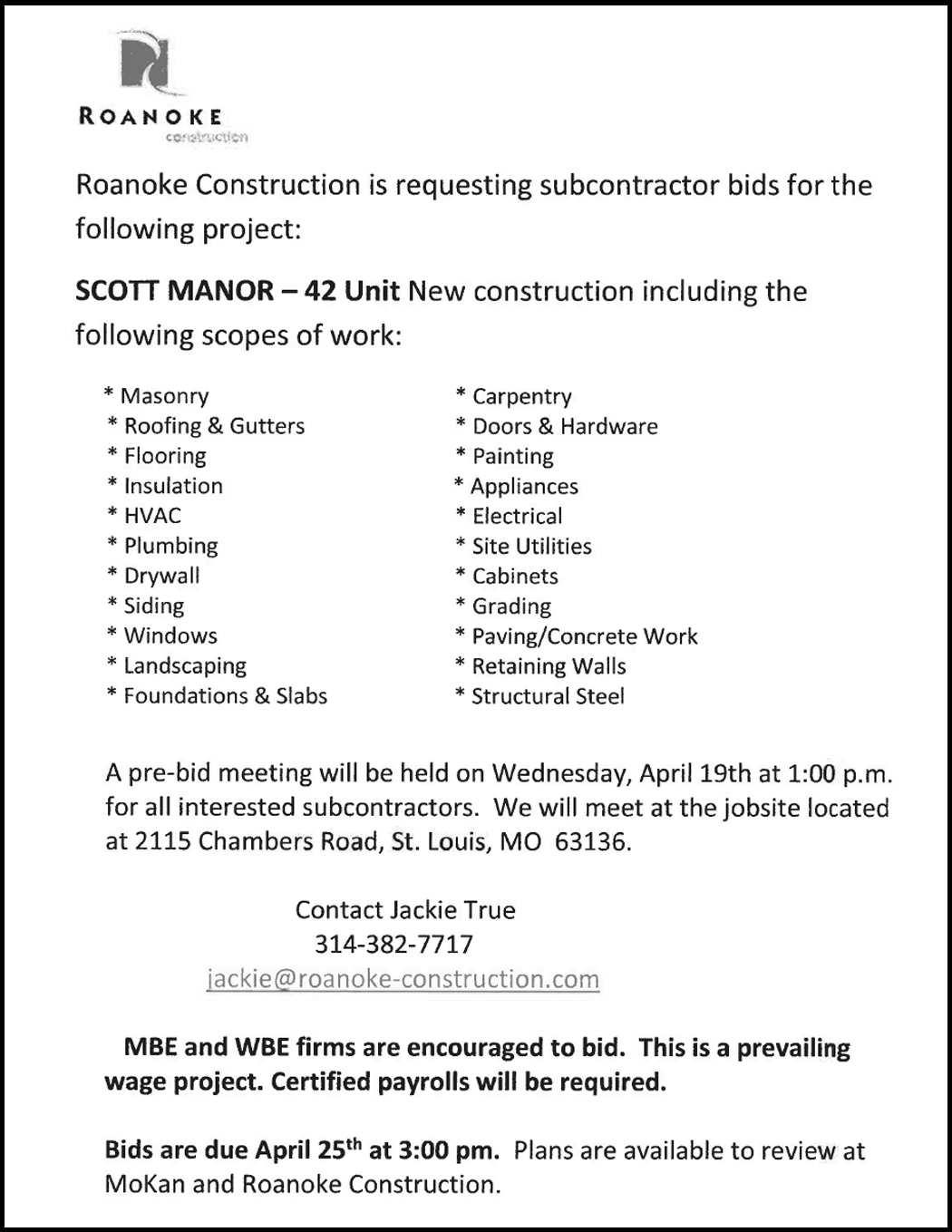 Subcontractor bids are due by 12:00 p.m. Wednesday, April 12, 2017. You may email bids to jwalters@kciconstruction.com or send a fax to 573-346-9739. Please call if you have any questions: 314-200-6496.