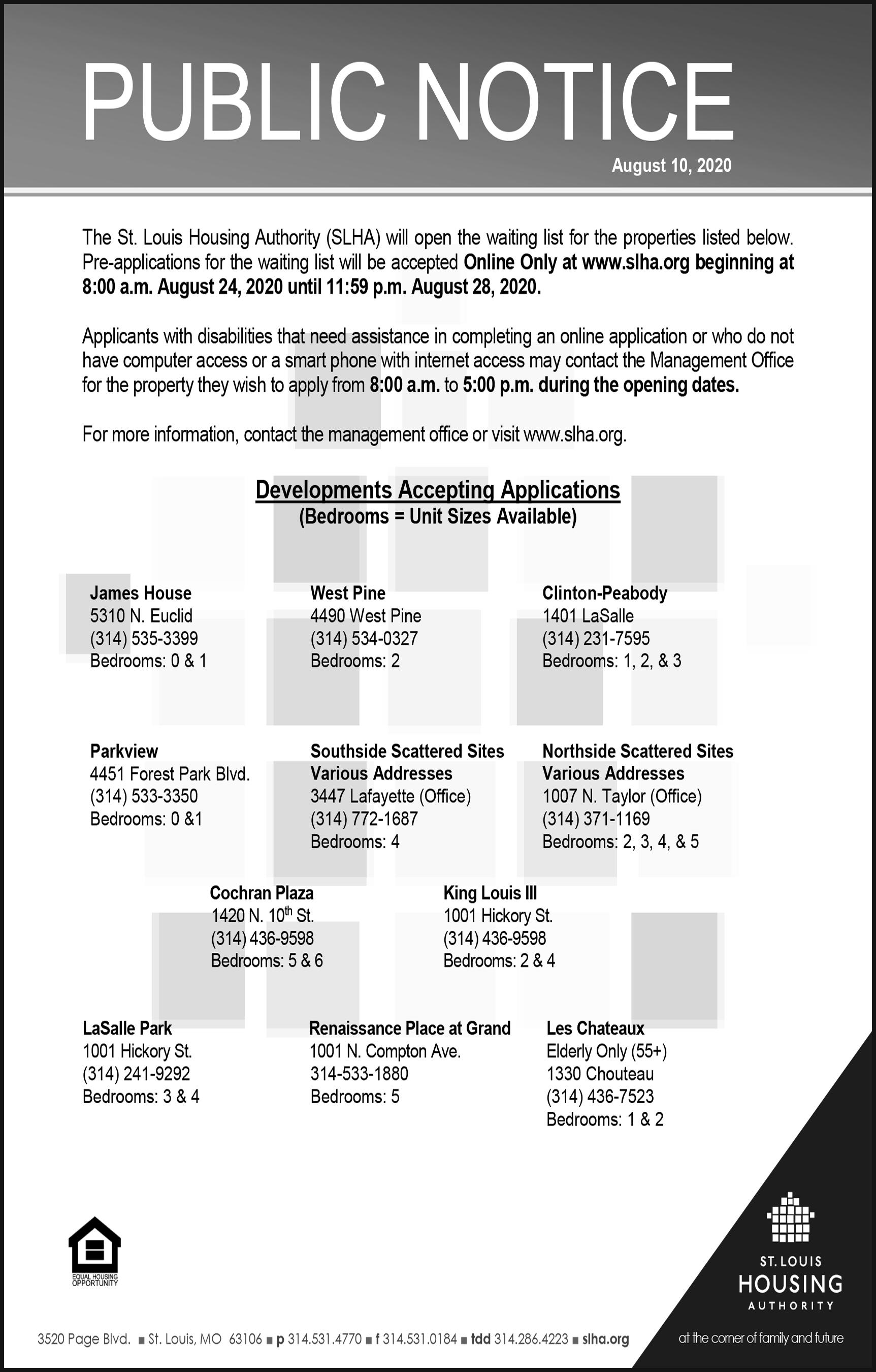 The Industrial Development Authority of the County of St. Louis, Missouri (the “IDA”) solicits proposals from qualified firms to serve as a financial advisor for the IDA’s operations. A copy of the complete RFQ is available at https:// stlpartnership.com/rfp-rfq/. DBE, MBE, and WBE consultants are encouraged to bid, and a five percent bid preference may be available to certified MBE firms. To be considered, proposals must be received no later than 3PM CST on Thursday, September 3, 2020.