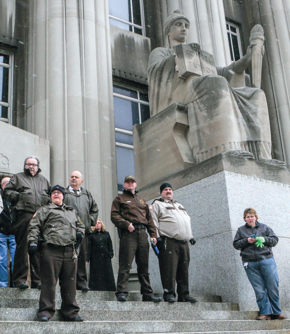 enter the building and was chanting outside the door, according to the statement. Aldridge allegedly “pushed” the city marshal blocking the door.