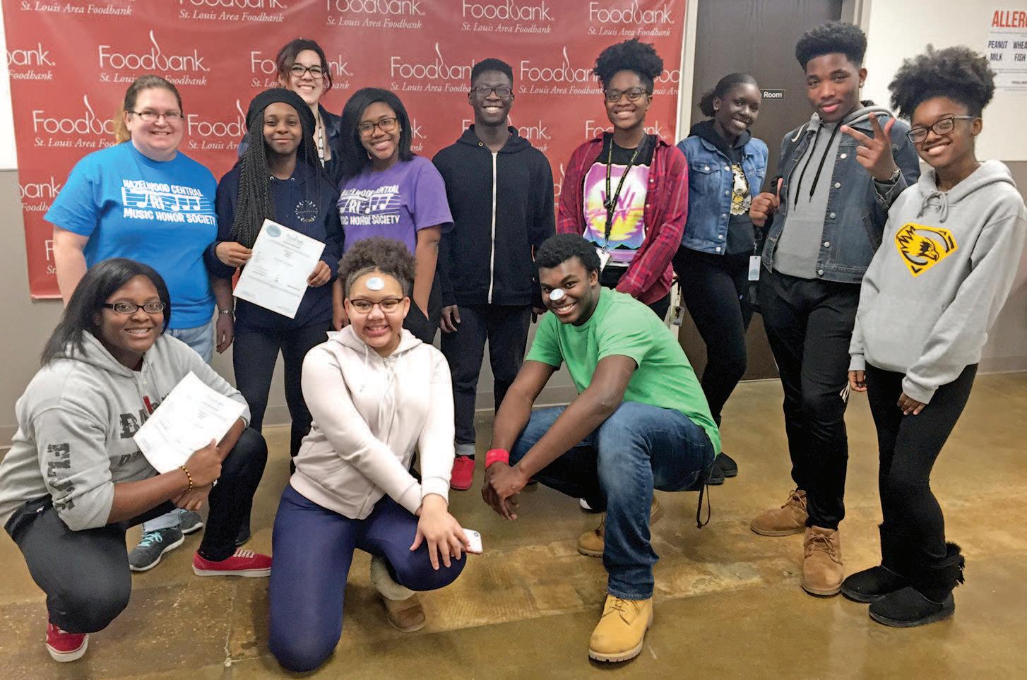 Members of the Hazelwood Central High School, National Honor Society for Musicians (Tri-M), recently volunteered at a food bank in St. Louis. As part of their service project, Tri-M members prepared boxes of meals for senior citizens. Overall, the students helped provide 19,608 meals for the hungry. This event was the last of three Tri-M’s service projects. Tri-M’s other two events include volunteering at the Hot Chocolate Run in downtown St. Louis and volunteering at the Ronald McDonald House. Left side: Aleah Miller, Garland Moore, Ron McDaniels, Ariel Tucker, Kaitlyn Franklin, Bri’Yana Merrill, Xavier Rainey. Right side: Ms. Jackson (parent), Allison Jackson, Kimberly Jackson, Hope Hamilton, Madeline Seyer, Elijah Williams, Helen French.