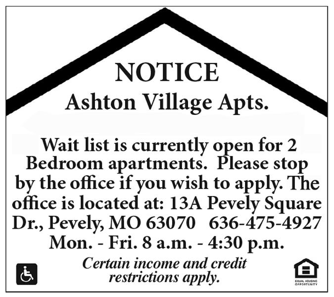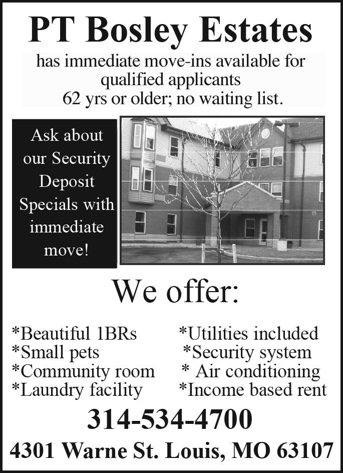 Plans and specifications will be available on January 14, 2019 from the St. Louis County Web Site (www.stlouisco. com), or by contacting County Blue Reprographics, Inc., 1449 Strassner Drive, St. Louis, Missouri 63144, (314) 961-3800. HARVEST HOUSE ROOM FOR RENT $100/wk, $100/dep Quiet, Clean Environment 314-537-4429 APARTMENT FOR RENT 1 Bed, Carpet, Stove,Fridge,
