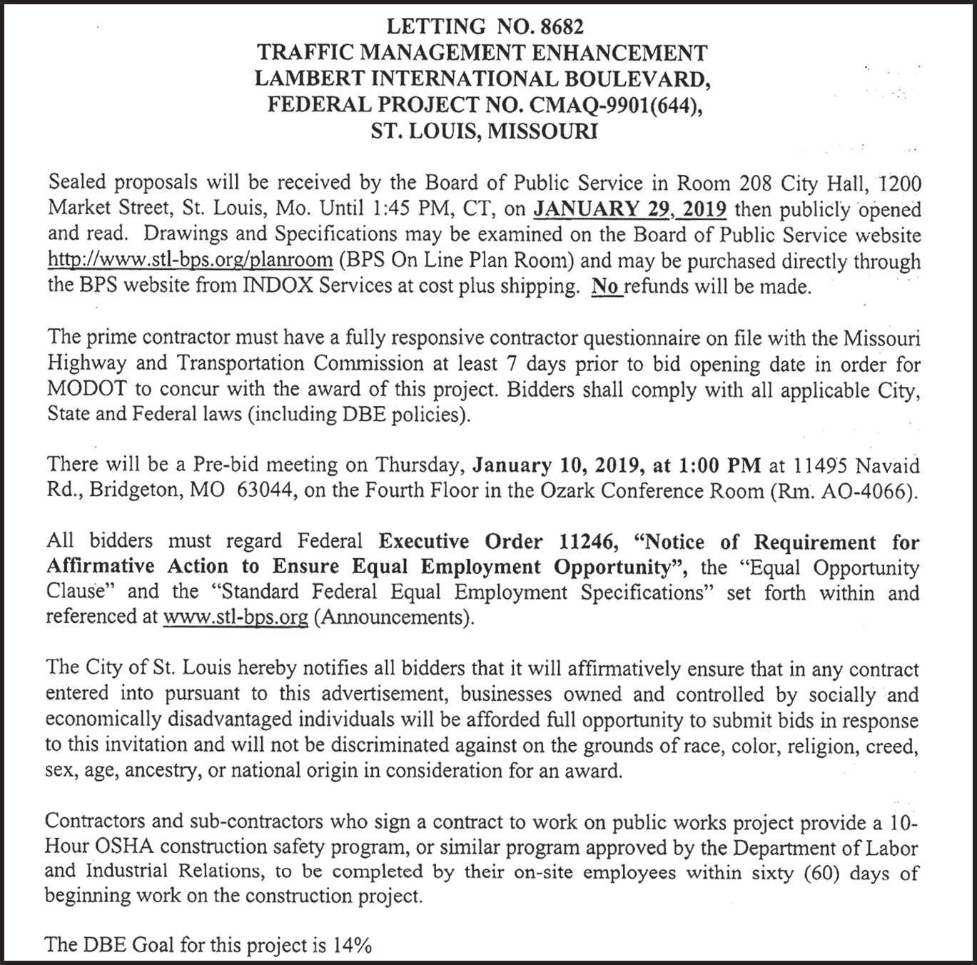 St. Louis, Missouri 63132. To be considered, proposals must be received no later than 3:00 PM CST on Thursday, January 24, 2019. Proposals should be sent by email to hbean@stlpartnership.com , or to St. Louis Economic Development Partnership, ATTN: Howl Bean II, 7733 Forsyth Blvd., Suite 2200, St. Louis, Missouri 63105. DBE, MBE, and WBE consultants are encouraged to bid, and a five percent bid preference may be available to certified MBE firms. The project may be funded in part by a grant from the U.S. Economic Development Administration, and all applicable federal regulations shall be in full force.