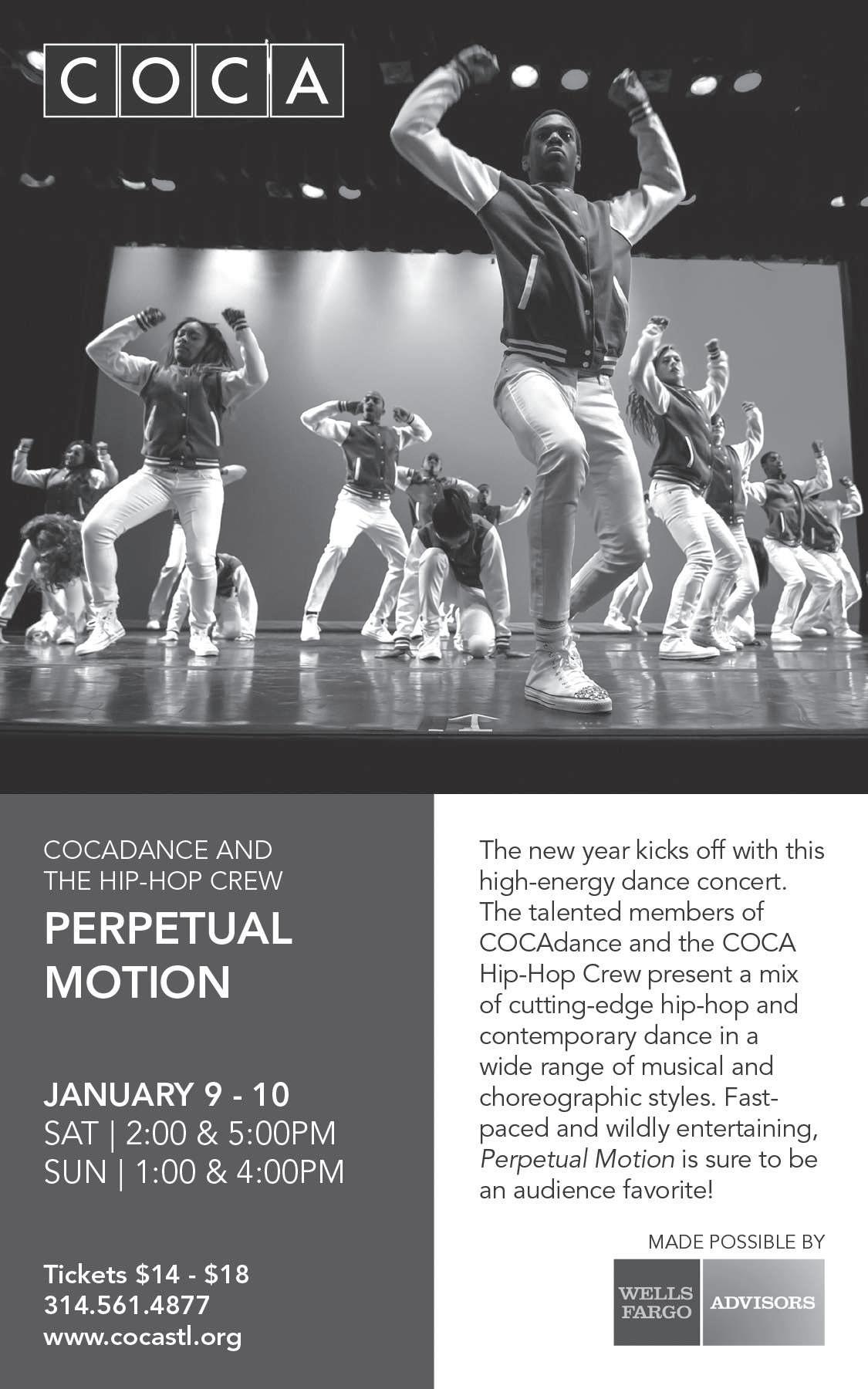 Jan. 9 – 10, COCA presents Perpetual Motion. The new year kicks off with a fast-paced dance concert that will have audiences grooving. Following in the popular traditions of “In the Loop,” the talented members of COCAdance and COCA Hip-Hop Crew present a mix of cutting-edge hip-hop and contemporary dance across a broad range of styles. 524 Trinity Ave., 63130. For more information, call (314) 7256555 or visit www.cocastl.org.