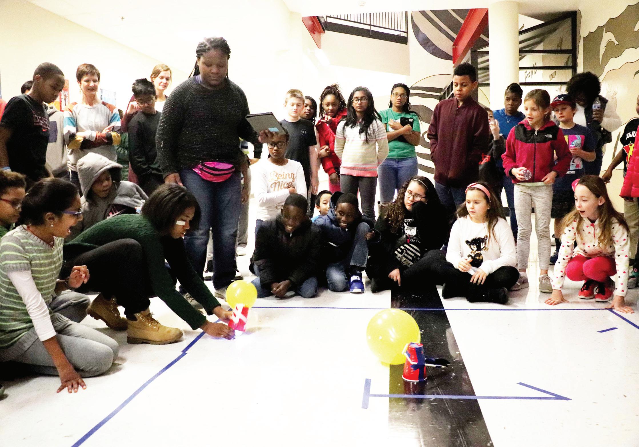 Students from Normandy Schools Collaborative and Parkway School District gather in the ring at Parkway Central High School to release robots they have programmed using coding. The students are participating in STEM Saturdays, a six-week program that is the result of an ongoing partnership with both school districts.