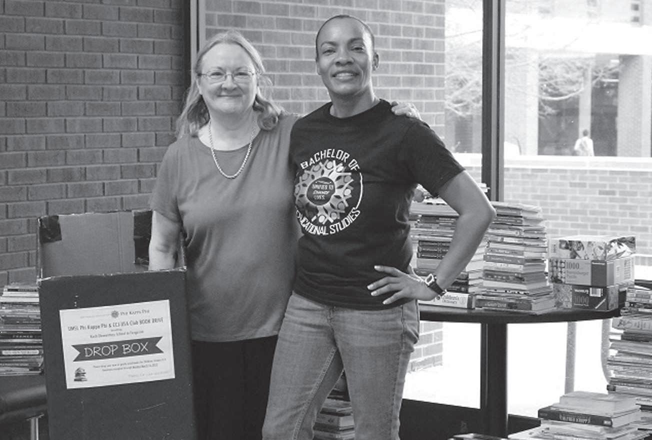 Shawntelle Fisher (right), founder and CEO of The SoulFisher Ministries, with Jeanne Zarucchi, professor of art history and French at UMSL, during a book drive Fisher organized in 2015 that allowed each Koch Elementary student to take home a new book to read over Spring Break.