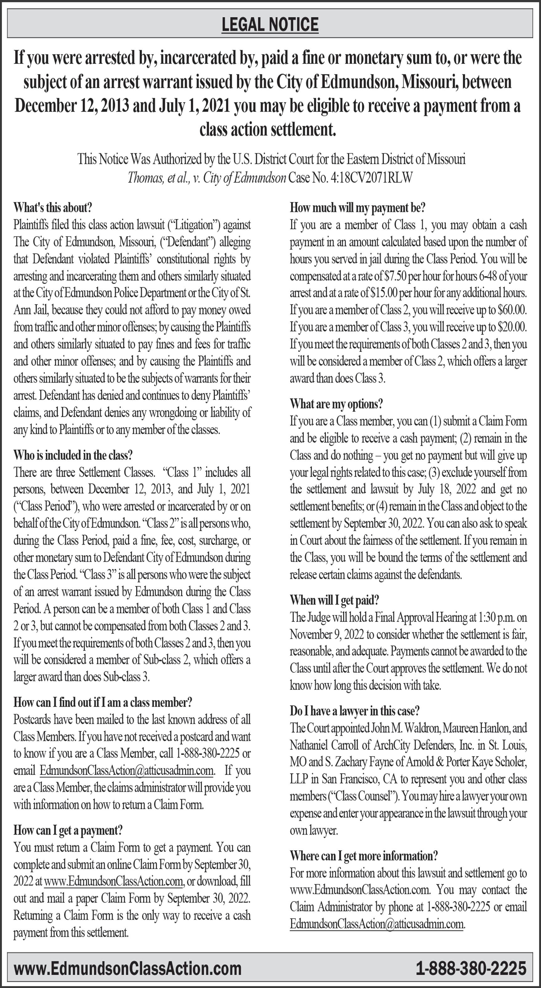 Electronic bids submitted through the Bid Express Online Portal will be received by the Board of Public Service until 1:45 PM, CT, on JULY 12, 2022, then publicly opened and read. Proposals must be submitted electronically using “Bid Express Online Portal” at https://www.bidexpress. com/businesses/20618/home. Plans and Specifications may be examined on the Board of Public Service website http:// www.stl-bps.org (BPS On Line Plan Room) and may be purchased directly through the BPS website from INDOX Services at cost plus shipping. No refunds will be made.