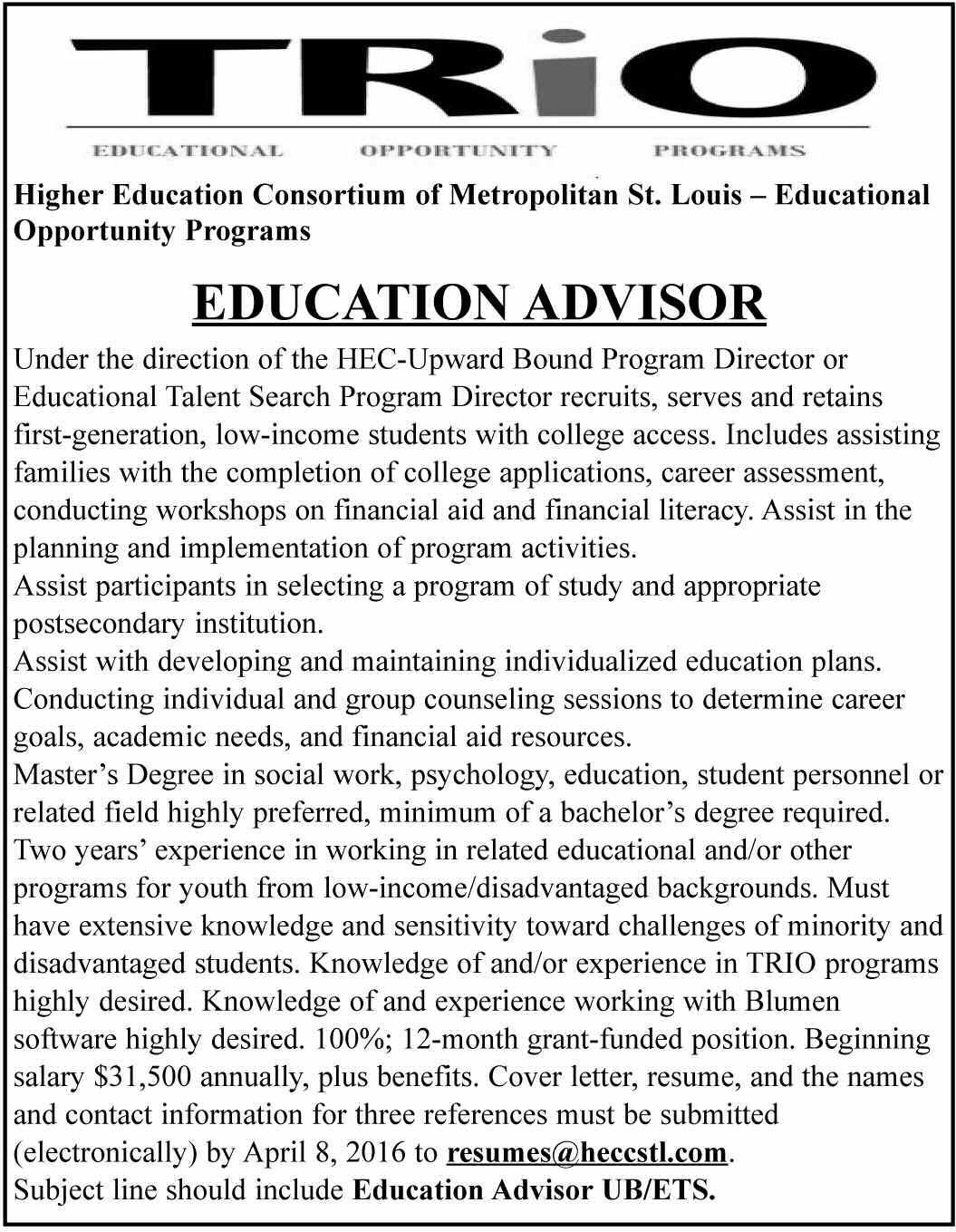 environment is necessary. Candidates will have a Bachelor’s degree and related experience. Applicants, please email resume with cover letter to jobs@explorestlouis.com NO PHONE CALLS. EOE.