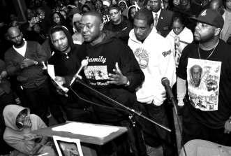 Rok from Bp Entertainment,Raymond Webber,Yung Ro,Mookie Page and Budda Page marched in support of slain Sanford,Fla.teenager Trayvon Martin in downtown St.Louis on Friday.Board of Aldermen President Lewis Reed organized the march down Market Street to the Soldiers Memorial.