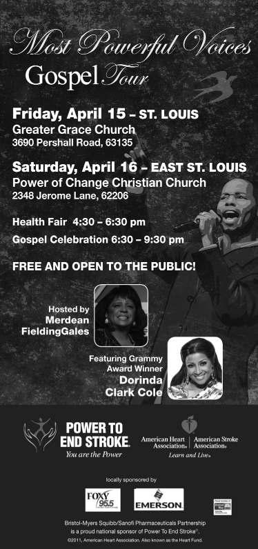 The American Heart/Stroke Association will present “Most Powerful Voices Gospel Tour –Health Fair and Concert” at two locations. April 15-16. Organizers promise, “Hundreds will join as they raise their voices in song to heighten awareness about stroke at the Most Powerful Voices Gospel Concert and Health Fair hosted by St. Louis gospel legend Merdean Fielding Gales, featuring Grammy award winner, Dorinda Clark Cole.”