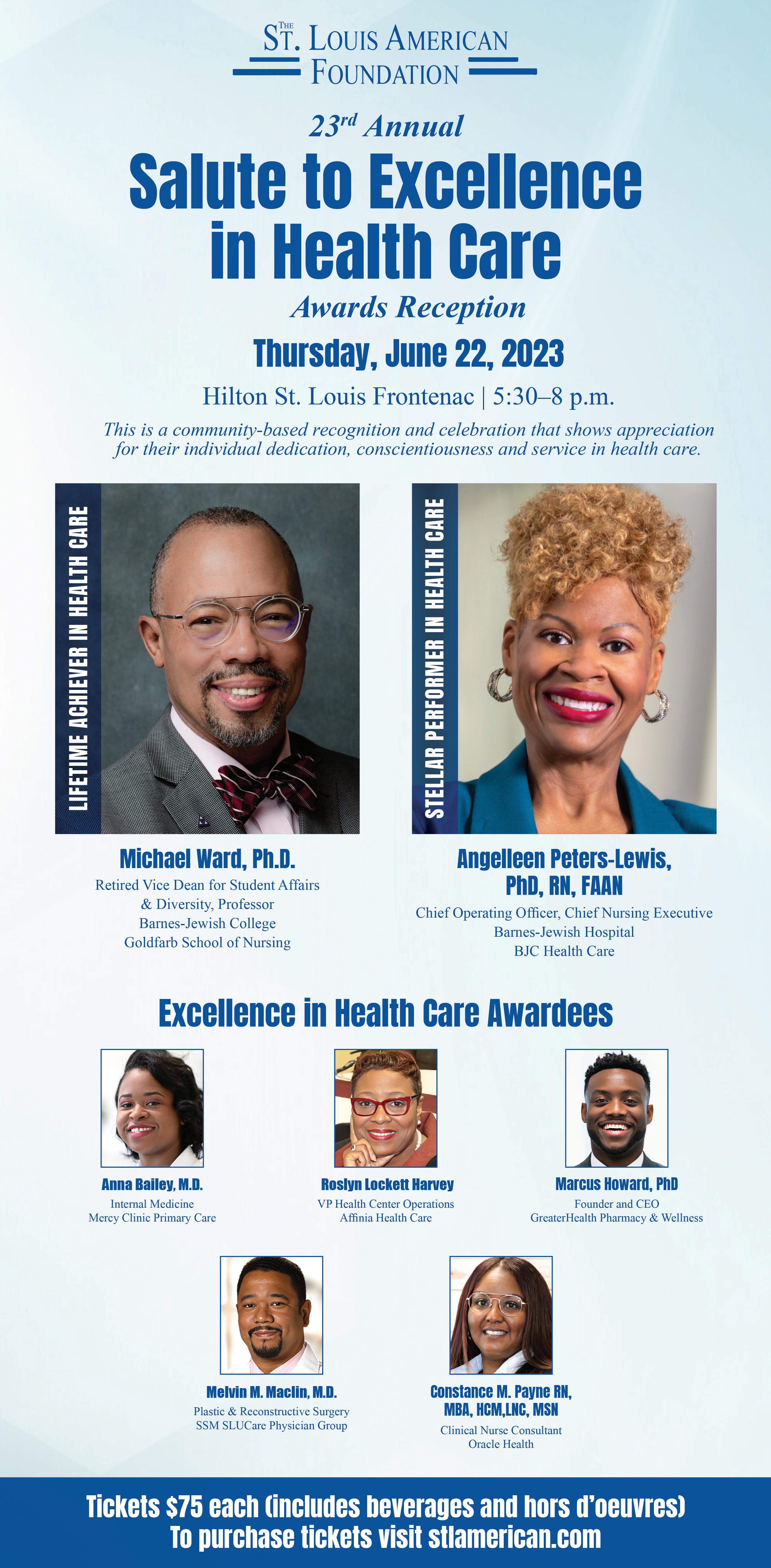 Five outstanding, dedicated healthcare professionals will receive Excellence in Health Care Awards at The St. Louis American Foundation’s 23rd annual Salute to Excellence in Health Care Awards Reception, June 22 at the Frontenac Hilton. They have diverse backgrounds in the medical field, ranging from an RN, to a doctor of internal medicine, a plastic surgeon, an assistant VP at a local Federally Qualified Health Center, and a native St. Louisan who came back to St. Louis to create one of the first culturally responsive pharmacies in the country.