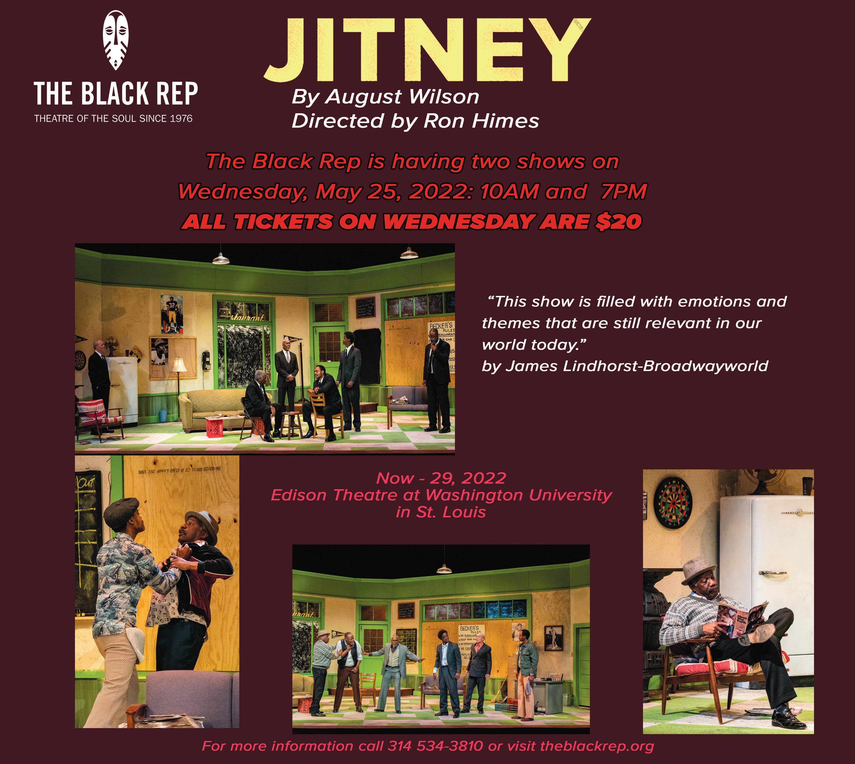 The Black Rep’s production of August Wilson’s Jitney continues through May 29th at the Edison Theatre on the campus of Washington University (6445 Forsyth). For additional information, visit www.theblackrep. org or call (314) 534-3807.
