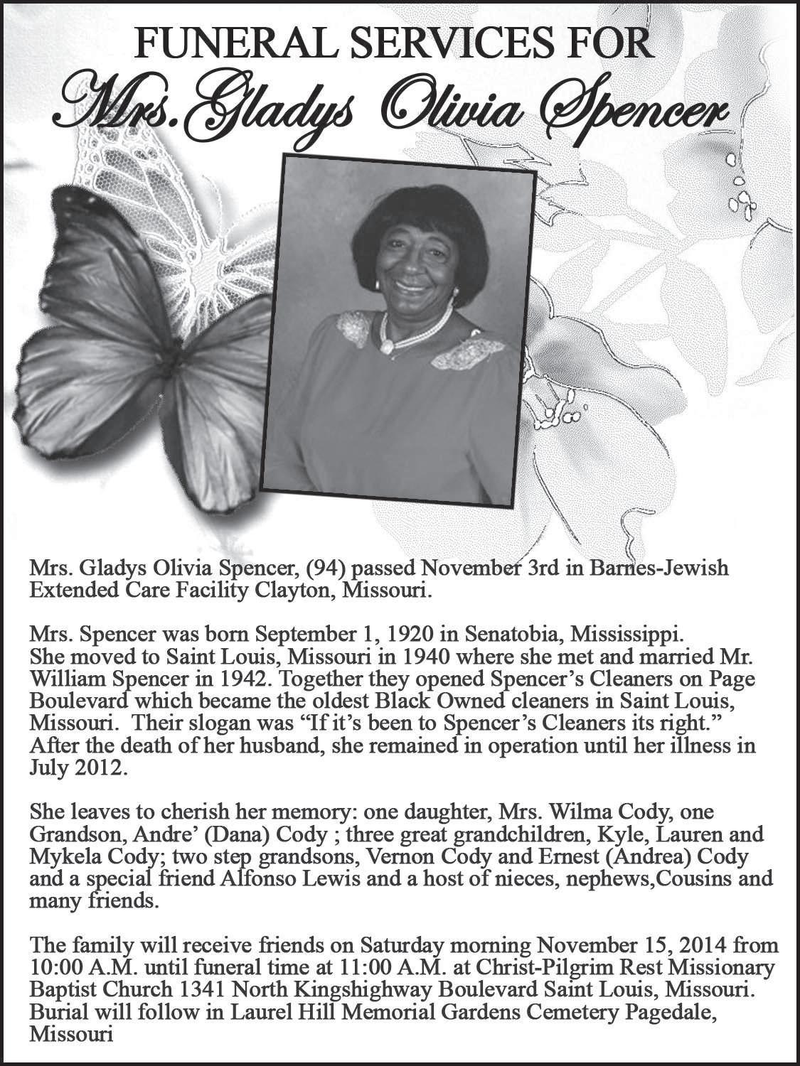 Happy 100th Birthday to Irene Smith on November 14! After graduating Homer Phillips School of Nursing, Irene was hired as one of the first AfricanAmerican nurses employed by Christian Hospital. She also served as the first African American elected as President of the Missouri Licensed Practical Nurses Association. She is a devoted member of West Side Baptist Church and still cherishes time spent in prayer and reading. She has two sons, Ezekiel (Brenda), and Alvin (Cynthia) Smith, two grandsons and four greatgrandchildren who visit her often in her Penrose area home. She has been heard often lately saying: “Ninety nine and a half won’t do!”