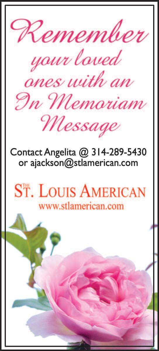 Do you have a celebration you’re proud of? If so we would like to share your good news with our readers. Whether it’s a birth, wedding, engagement announcement, anniversary, retirement or birthday, send your photos and a brief announcement (50 words or less) to us and we may include it in our paper and website – AT NO COST – as space is available Photos will not be returned. Send your announcements to: kdaniel@stlamerican. com or mail to: St. Louis American Celebrations c/o Kate Daniel 2315 Pine St. St. Louis, MO 63103 FREE OF CHARGE